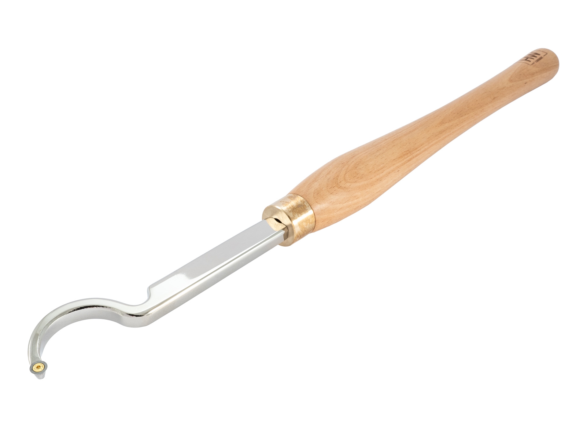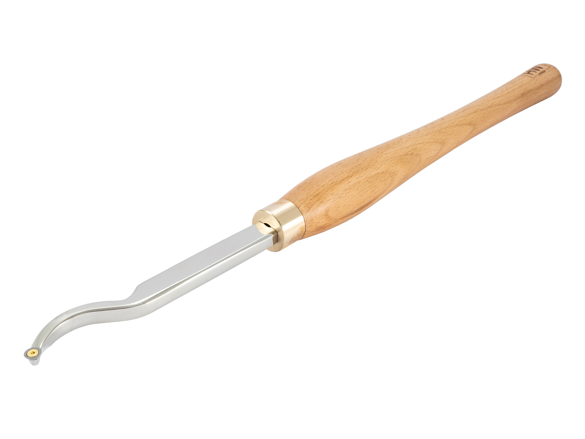 Eingesetzt für hinterdrehte Formen, im Regelfall für die Innenbearbeitung von stark gewölbten Vasen oder hinterschnittene Schalen. Sie können dieses Werkzeug mit einem Überstand von mindestens 80 mm bis maximal 130 mm über die Werkzeugauflage hinaus verwenden.