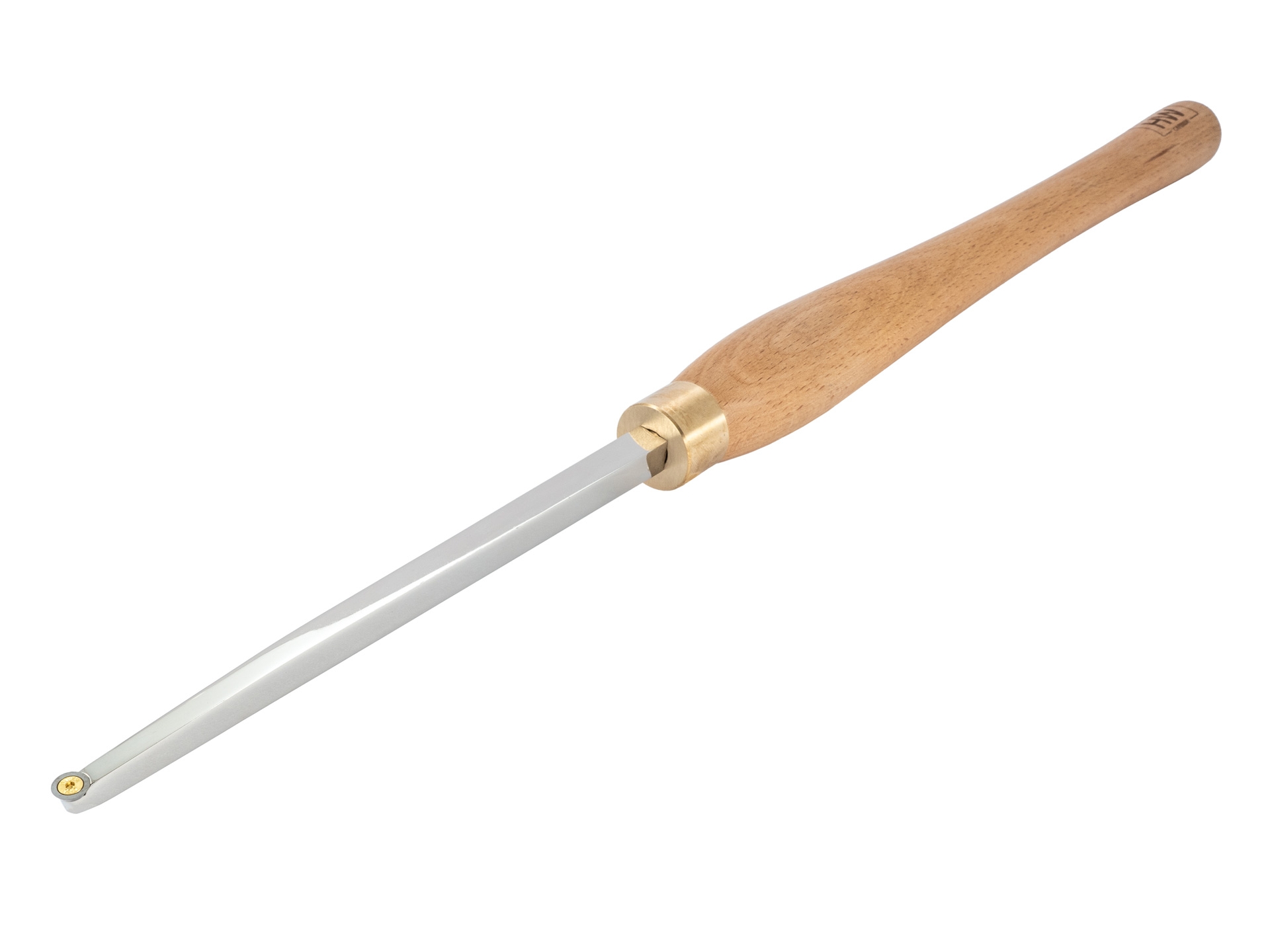 Das Ausdrehmesser wird für geschwungene Formen - im Regelfall für die Innenbearbeitung von leicht gewölbten Vasen - verwendet. Sie können dieses Werkzeug mit einem Überstand von mindestens 80 mm bis maximal 130 mm über die Werkzeugauflage hinaus verwenden.