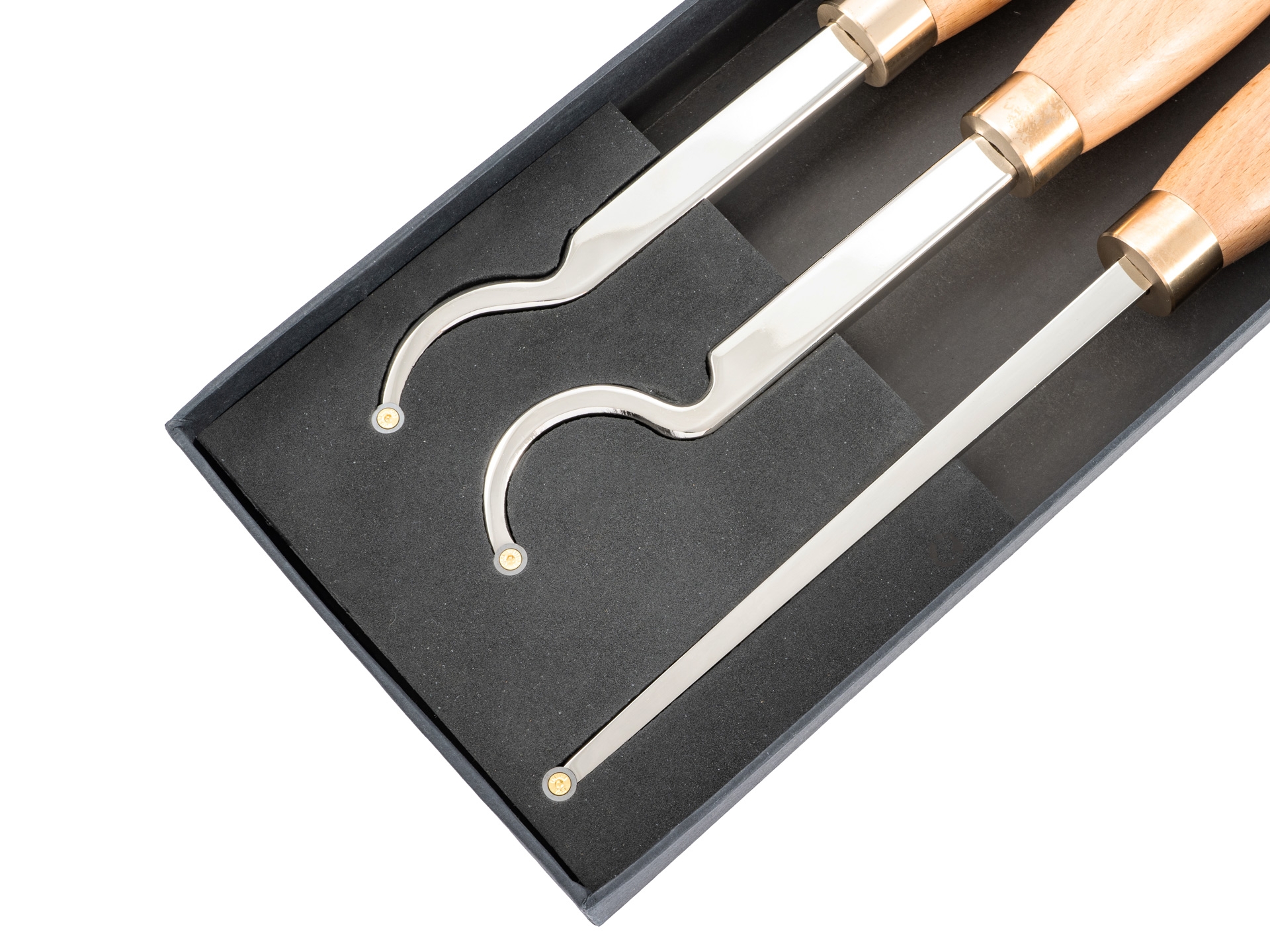 Drechselmesser SET zur Bearbeitung von Hohlformen wie Vasen, Dosen oder auch hinterdrehte Schalen. Mit einfach wechselbaren Karbid - Hartmetallschneiden.
