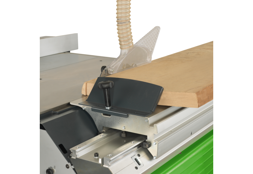 Aus massivem Stahlblech lässt sich auf „X-Roll“-Formatschiebetisch in den T-Nuten montieren. Der Besäumschuh kann auch als Rückschlagsicherung beim Einsatzfräsen eingesetzt werden.