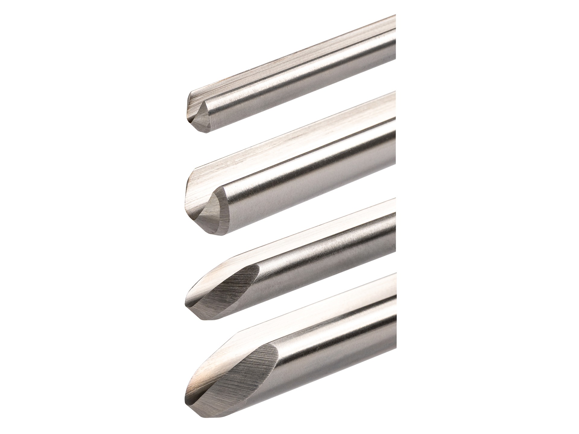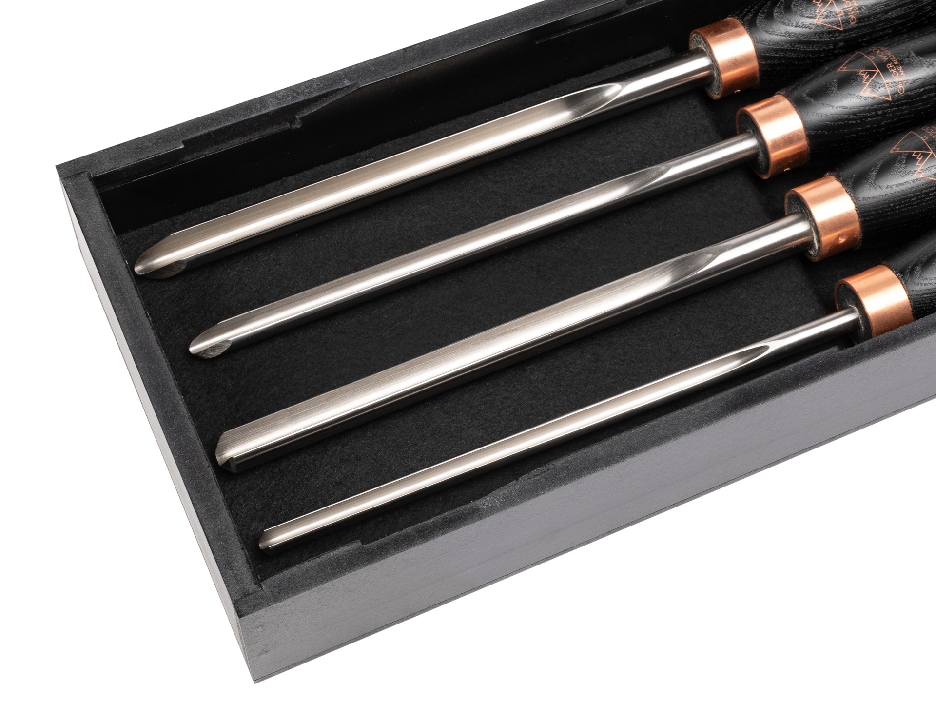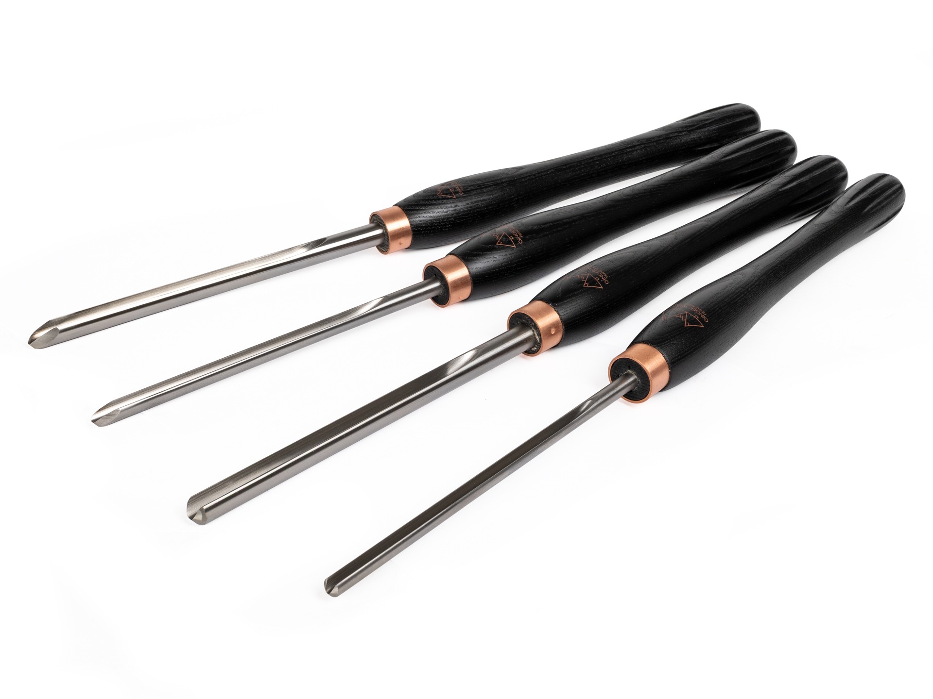 4 Schüsseldrehröhren unterschiedlicher Stärke, mit speziellen Anschliffen perfekt abgestimmt für jede Situation beim Schalendrechseln: