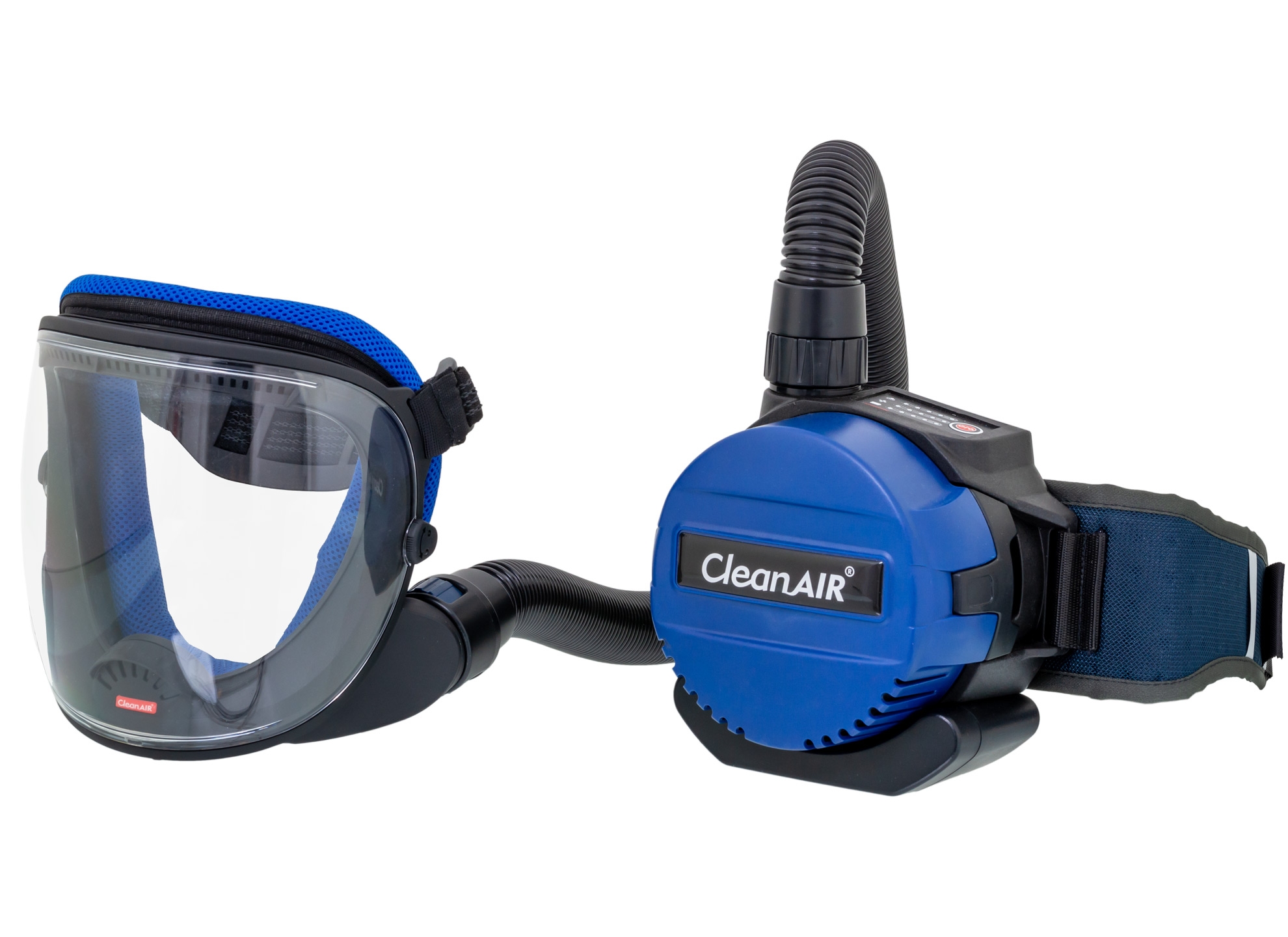 CleanAIR Komplettset „Drechsler“ bestehend aus Schutzmaske UniMask, Atemschutzsystem Basic, QuickLOCK Schlauch und passendem Zubehör.