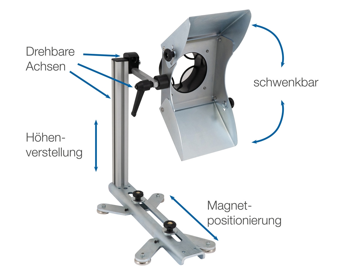 Die Positionierung erfolgt über 4 magnetische Füße, welche auf das jeweilige Bankbett einstellbar sind. Damit ist diese Absaugvorrichtung für die meisten Drechselmaschinen geeignet. Absaugvorrichtung wird ohne Absaugschlauch geliefert.
