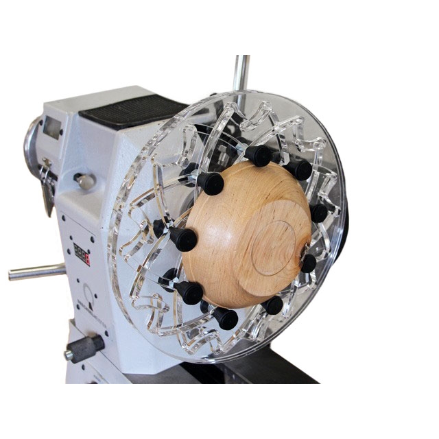 Sehr einfacher und effektiver Verstell-Mechanismus! Durch Verschieben der beiden Aufnahmeplatten aus speziellem Kunststoff können auch fertig gedrechselte Werkstücke sicher und ohne Beschädigung zur Weiterbearbeitung eingespannt werden (z.B. zur Entfernung des Halterezesses an der Unterseite einer Schale usw.). Inkl. 9 Standard-Haltepins (Spannstifte 20 mm), diese laufen konzentrisch zusammen.