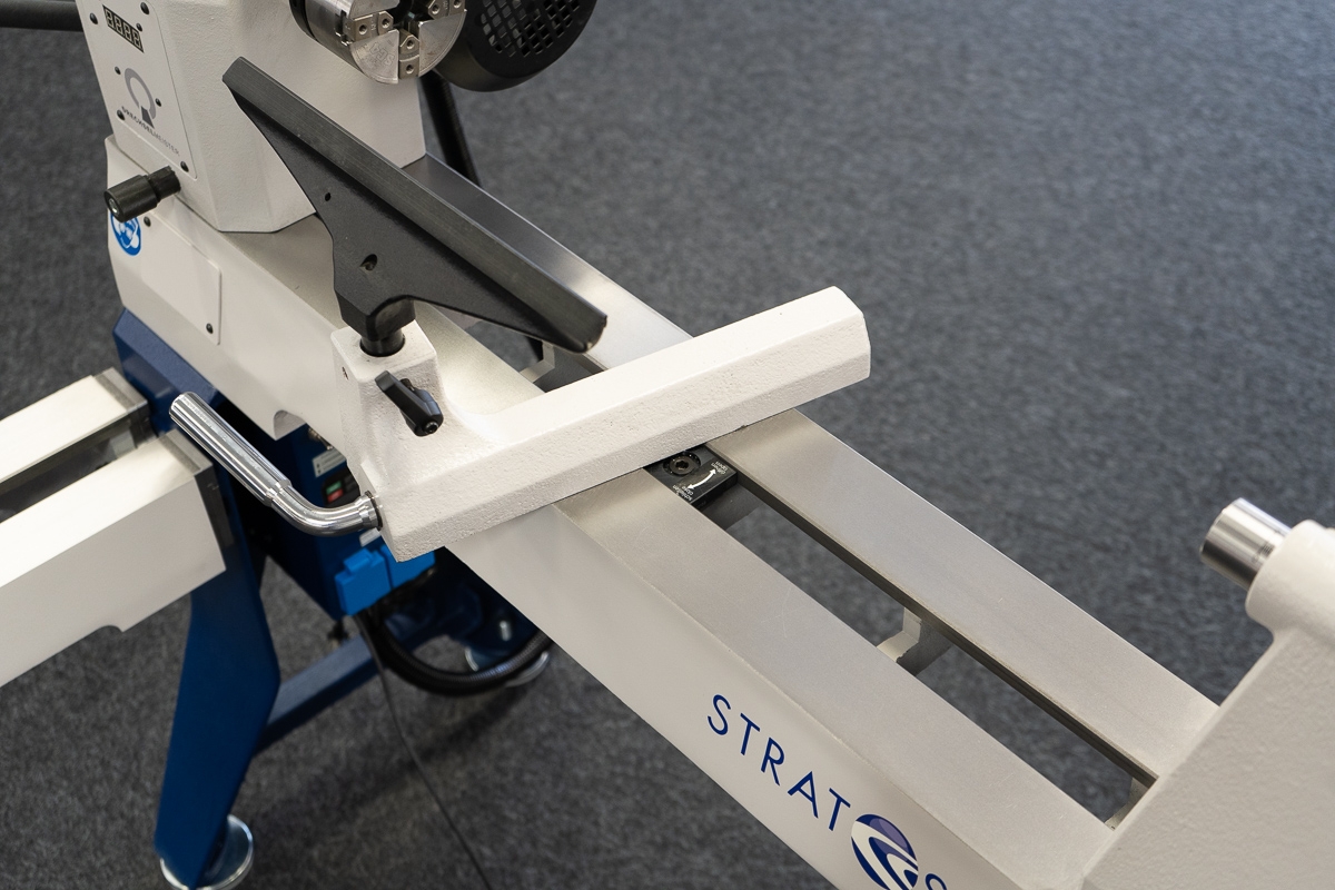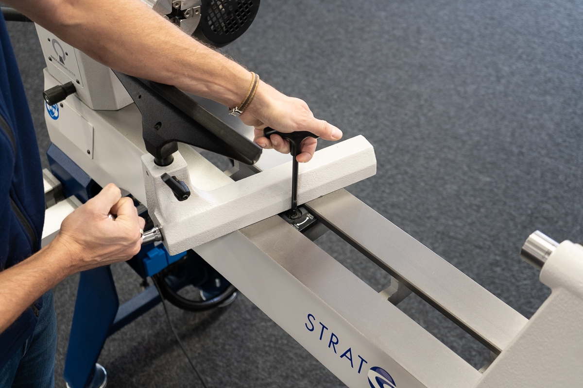 Mithilfe eines Innensechskantschlüssels wird das Handauflagenunterteil sekundenschnell entriegelt und kann nach oben aus dem Bankbett gehoben werden. Somit ist ein schneller Wechsel der Handauflage z.B. fürs Außendrehen ohne Entfernen des Reitstocks möglich!