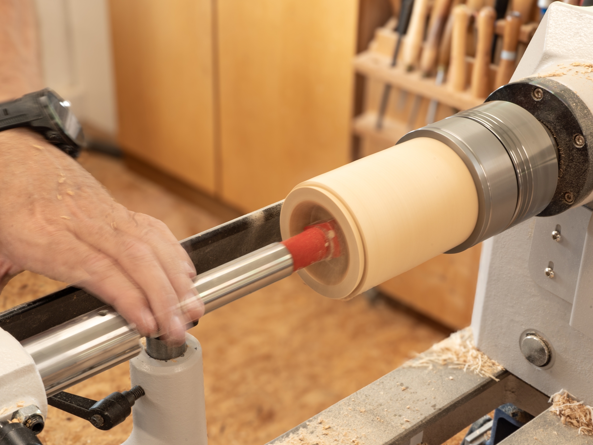 Der Tiefenbohrer GROSS mit variabler Bohrgrößeneinstellung zwischen 70 - 85 mm ist eine Weiterentwicklung der Reitstock Bohrvorrichtung mit HSS Schneiden. Waren beim Vorgänger nur fixe Schneidenmaße möglich, können mit der neuen, variablen Bohrvorrichtung mehrere flexible Größen gebohrt werden.