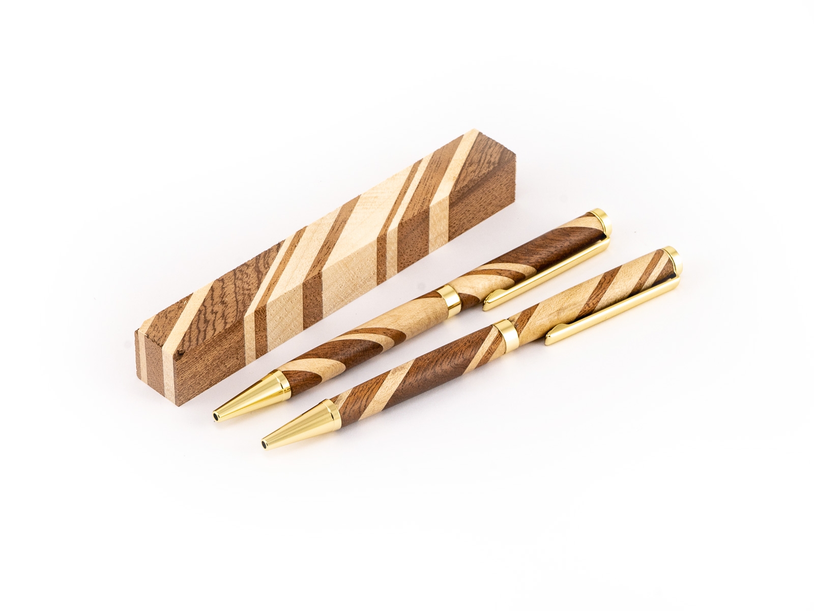 Das SET besteht aus längs- und querverleimten Rohlingen, die nach dem Drechseln ein schönes Muster bilden.