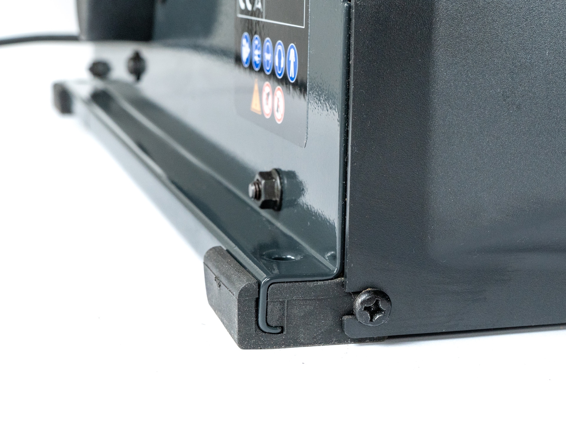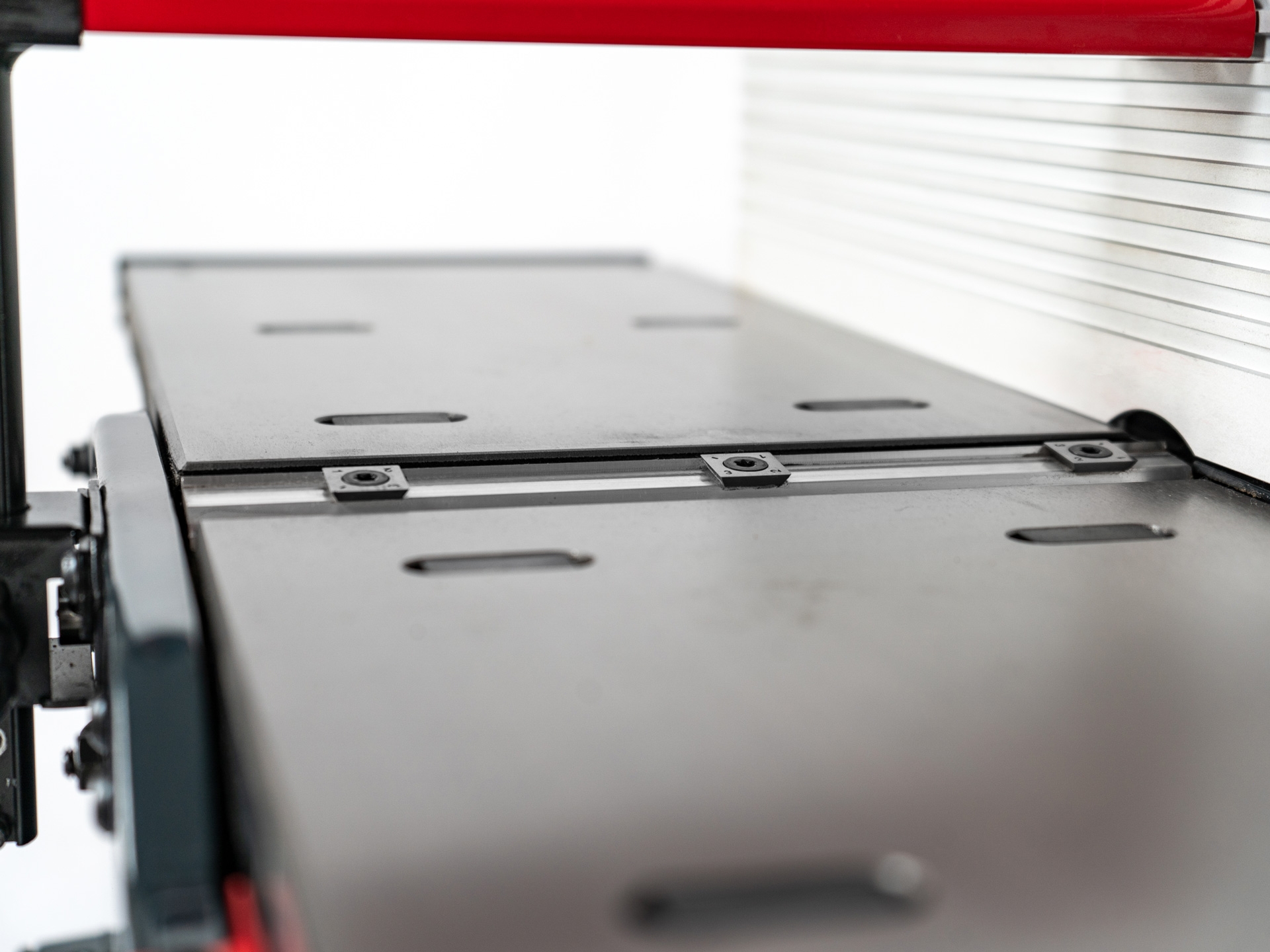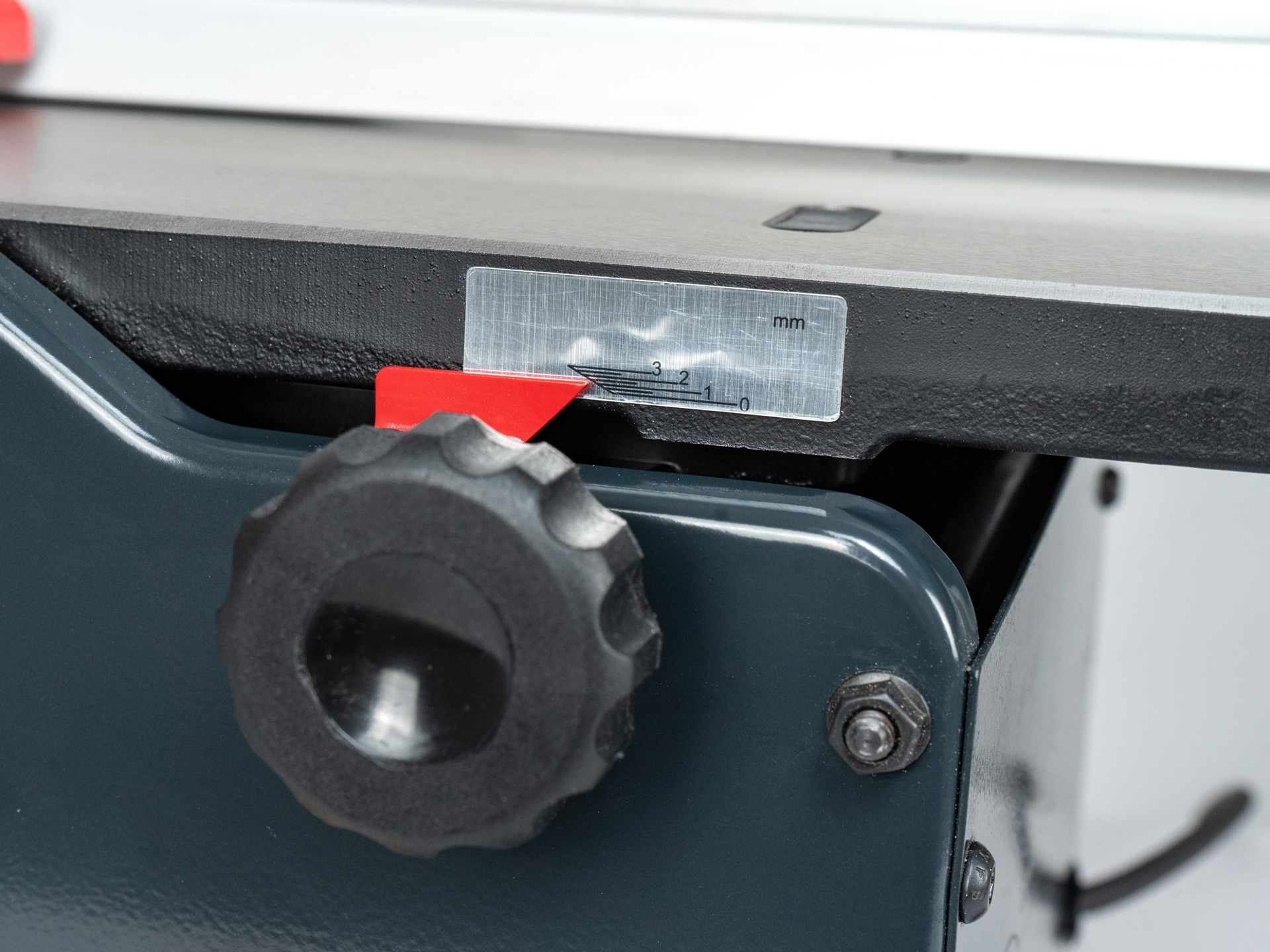 Der schwenkbare Winkelanschlag ermöglicht Kanten von 90° bis 45°. Die Gesamtlänge der Grauguss-Tische beträgt 770 mm und kann mit den integrierten Tischverlängerungen auf 1.350 mm erweitert werden.