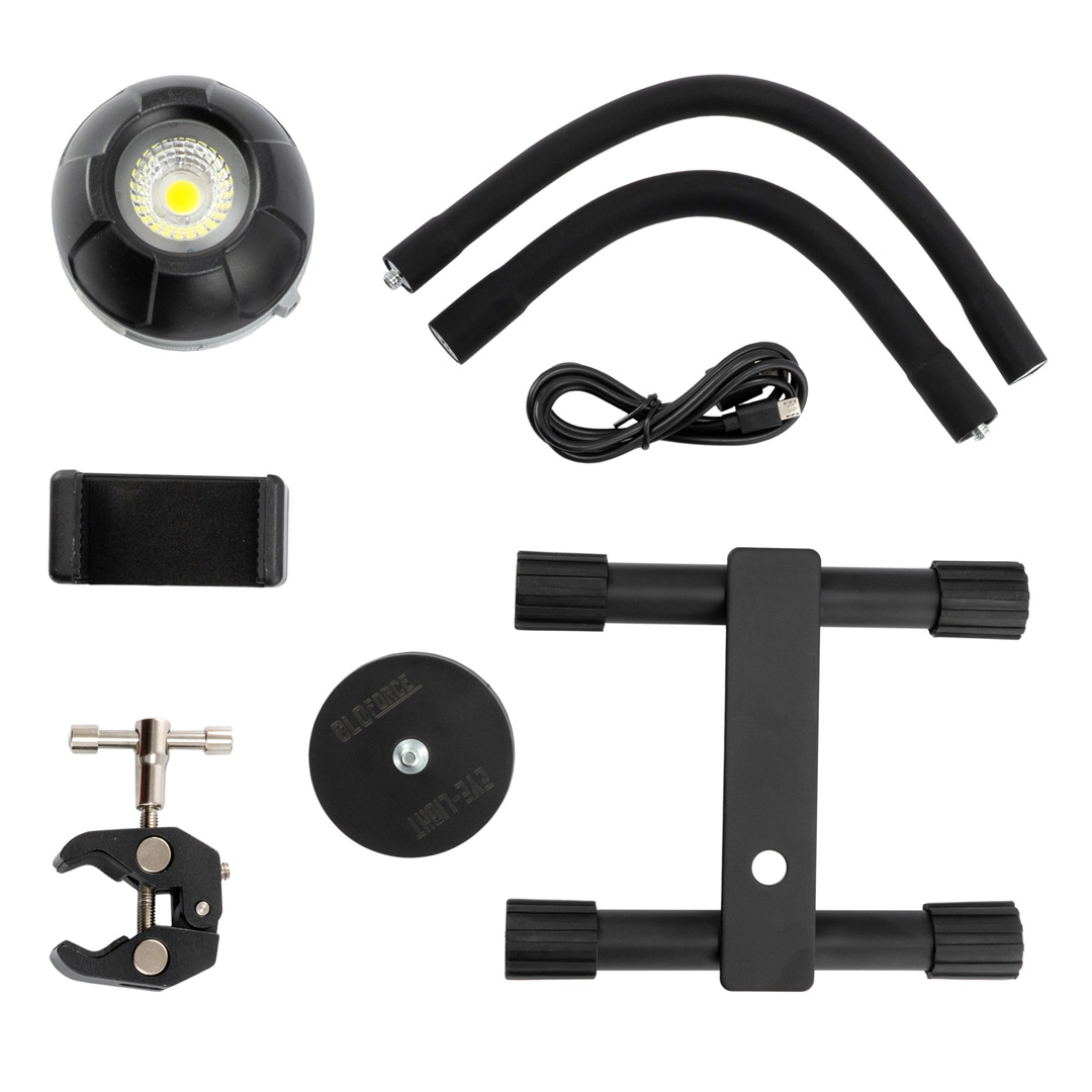SET aus Glo-Force EYE LIGHT Lampenkopf inklusive Schaft, USB Ladekabel, Klemmzange und Smartphone-Halterung.