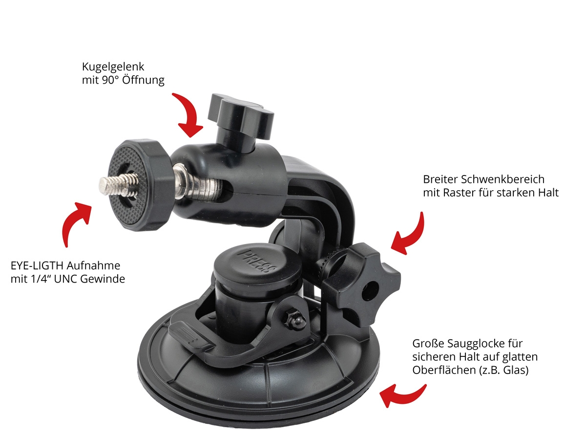 Dieser Saugnapf befestigt die EYE-LIGTH LED Lampe oder andere Anbauteile mit 1/4″ UNC-Gewinde an einem Fenster oder einer nicht porösen Oberfläche. Mithilfe des Kugelgelenks und des beweglichen Arms kann das Licht in unterschiedliche Richtungen ausgerichtet werden.