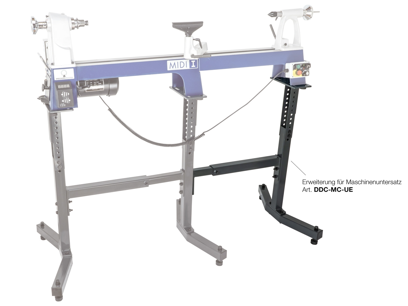 Wenn auf einer Tisch-Drechselbank mit Maschinenuntersatz eine lange Bankbettverlängerung montiert werden soll, benötigt man aus Stabilitätsgründen diese Erweiterung.