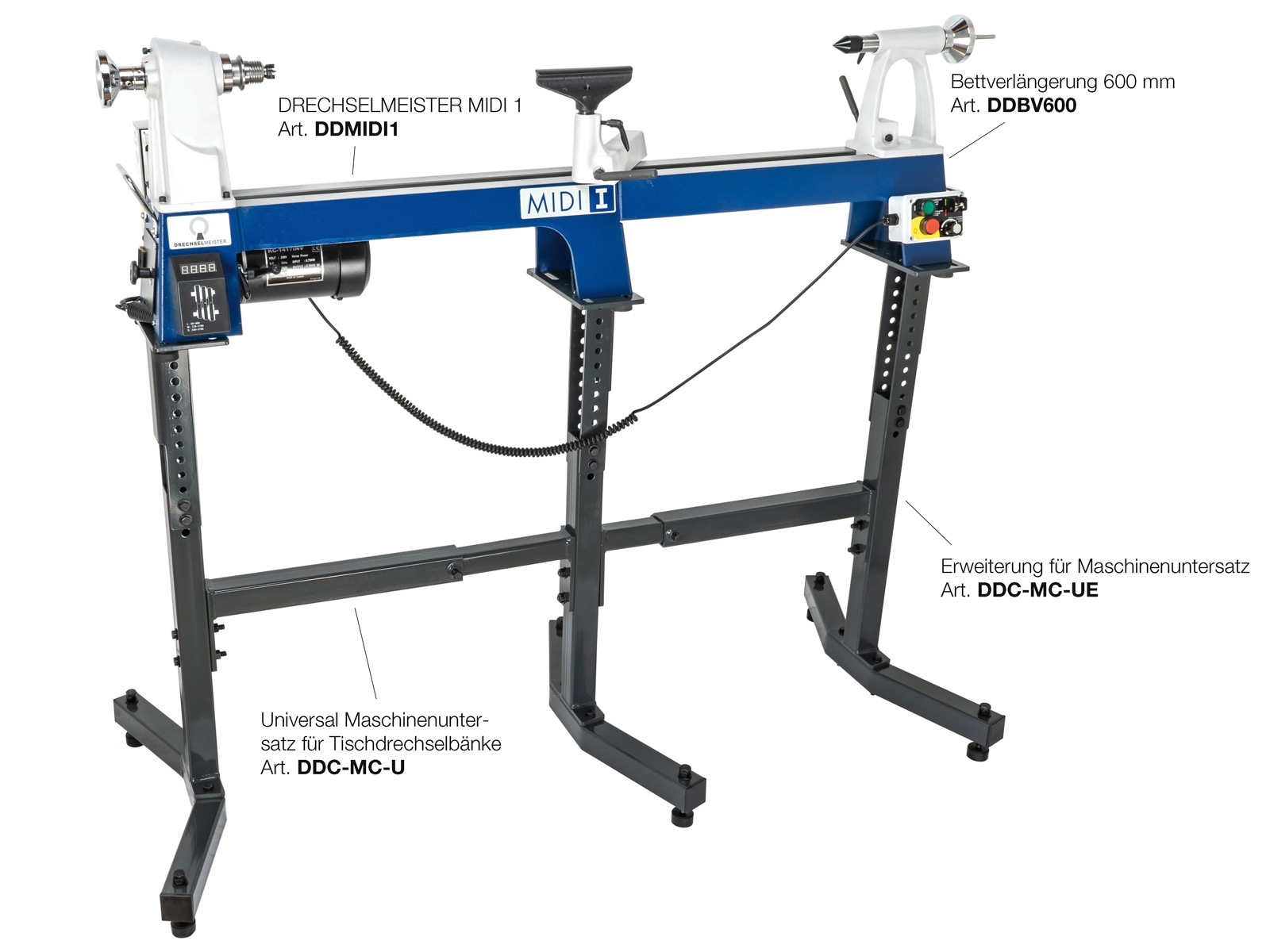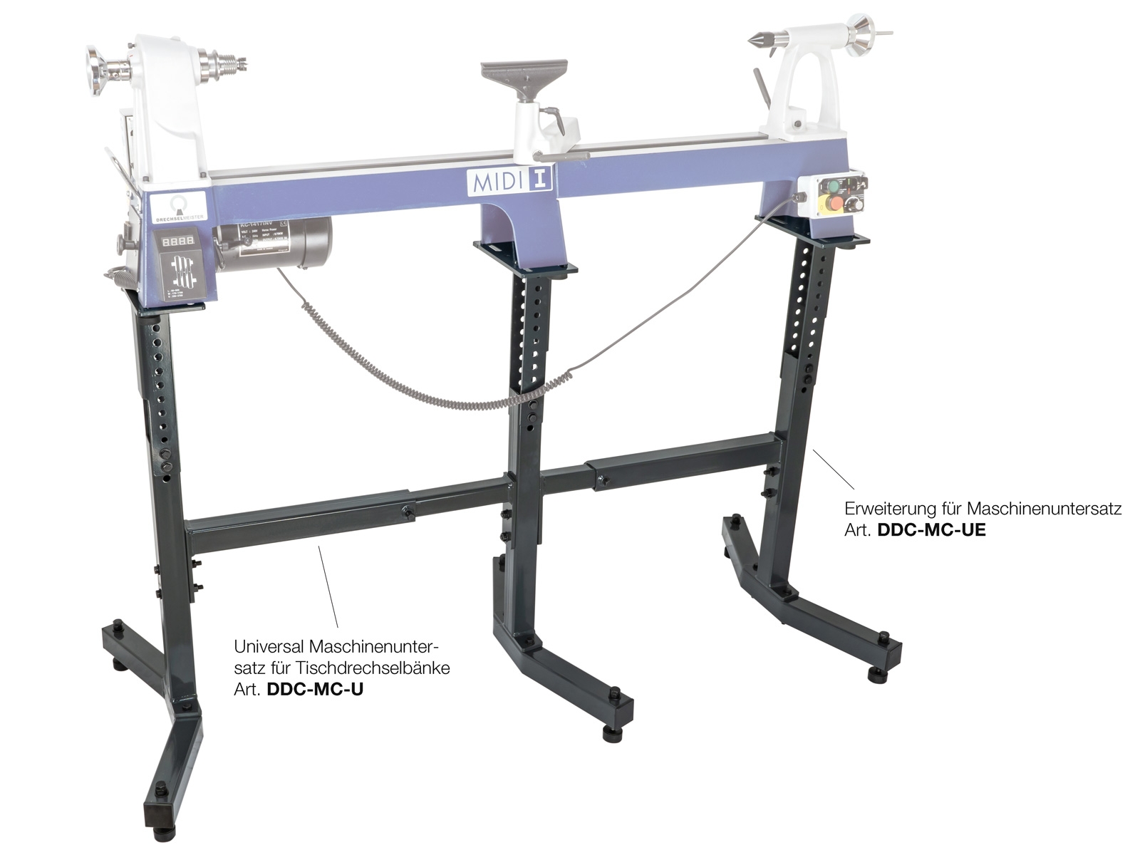 Universal-Maschinenuntersatz in robuster Ausführung, passend für verschiedene Tischdrechselbänke.Die Montage der Tischdrechselbänke erfolgt direkt auf den Maschinenuntersatz, in der Regel können die Stell-Füßchen der jeweiligen Tischdrechselbank für die Fixierung verwendet werden. Die Arbeitshöhe kann über definierte Montagepunkte frei eingestellt werden. Passend für folgende Modelle:MINITEC E-125MIDITEC FU-175MIDI 1MIDI 2TEKNATOOL Comet-2Dank der universellen Bohrungen passt der Unterbau auch für viele andere Tisch-Drechselmaschinen (siehe Infografik).ACHTUNG: Wenn der Maschinenuntersatz für größere Tischdrechselbänke (mit breiten Auflageflächen) verwendet werden soll, muss eine Zwischenplatte selbst angefertigt und verwendet werden. (z.B. MIDI 2 PLUS und MIDI PRO Tischdrechselbank: Aufgrund des breiter ausgeführten Bankbettes der MIDI 2 PLUS und MIDI PRO Maschinen empfehlen wir hier generell die Verwendung des Maschinenuntersatz "PRO" (Art. 008824)!Technische Daten:Farbe anthrazit (RAL 7016)Höheneinstellung ca. 62 bis 89 cmGrößenangaben siehe Infografik(Lieferung ohne Drechselmaschine!) Marke / Hersteller / Produktverantwortlicher:Neureiter Maschinen GmbHKellau 167, 5431 KuchlÖsterreich