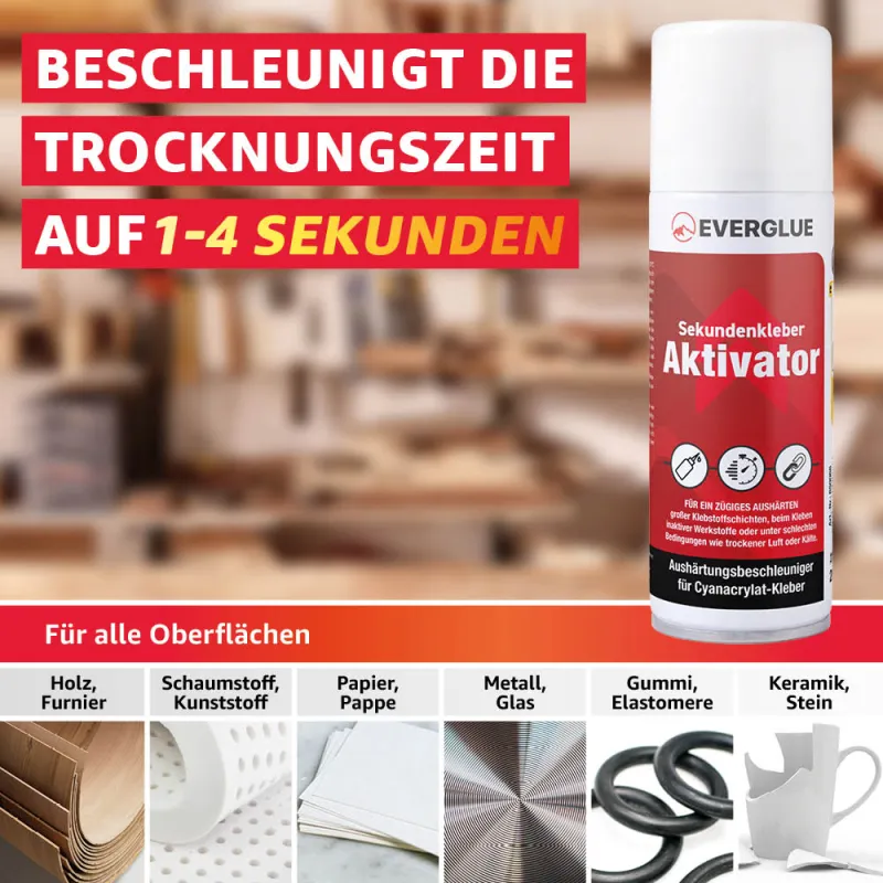Entdecken Sie das Everglue Aktivator Spray, Ihren unverzichtbaren Verbündeten, wenn es um die Beschleunigung der Aushärtungszeit von Cyanacrylat-basierten Sekundenklebern geht. Dieses Spray wurde speziell entwickelt, um die Möglichkeiten traditioneller Klebstoffanwendungen zu erweitern. Es ermöglicht eine blitzschnelle Aushärtung selbst umfangreicher Klebstoffschichten und garantiert eine robuste Verbindung innerhalb von Sekunden – selbst unter den anspruchsvollsten Bedingungen wie niedrigen Temperaturen oder geringer Luftfeuchtigkeit. Ideal für eine Vielzahl von Anwendungen, verbessert dieses Spray nicht nur die Effizienz Ihrer Arbeit, sondern ermöglicht es, verschiedenste Materialien sicher und zuverlässig zu verkleben.