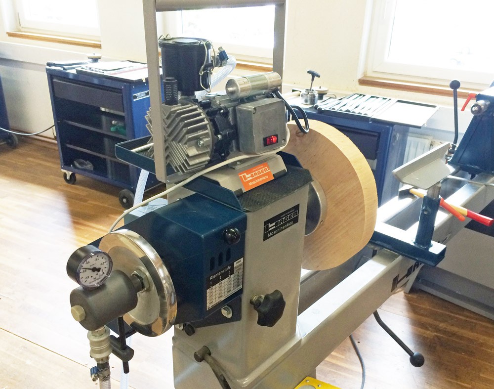 Mit diesem System können flache Werkstücke sehr zeitsparend fliegend gespannt werden. Holzunebenheiten werden von dem flexiblen Saugspannfutter ausgeglichen und absolut sicher gehalten. Um Werkstücke exakt am Mittelpunkt zu zentrieren, befindet sich eine gefederte Zentrierspitze im Saugspannfutter. In die linke Seite der Hauptspindel wird die drehbare Vakuumzuführung gesteckt und mit einer Schraube mit Dichtungsring geklemmt. Die auf Dauerbetrieb ausgelegte Vakuumpumpe arbeitet sehr leise und effizient. Voraussetzung für die Verwendung ist eine Maschine mit Hohlspindel.