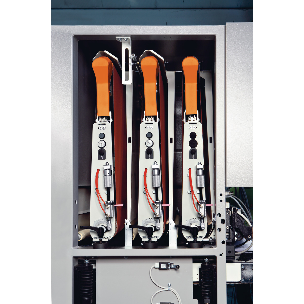- Optional RTC 110 Ausführung mit Hobelwellenaggregat Ø 140 mm anstelle des ersten Schleifaggregats (mit 312 Wendeschneidplatten mit je vier Schneiden, Glieder-Druckelement, Rückschlagsicherung und Pneumatikzylinder)