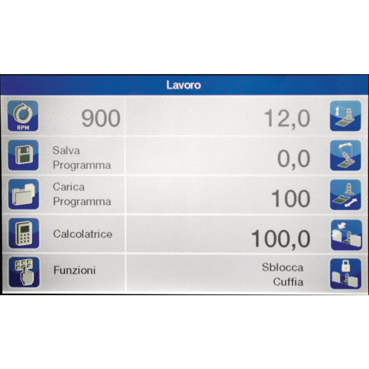 - Großer 7" Bildschirm, 16:9 Format. Alle Spindelsteuerungen sind auf einer Seite und erlauben eine schnelle Einstellung der Maschine.