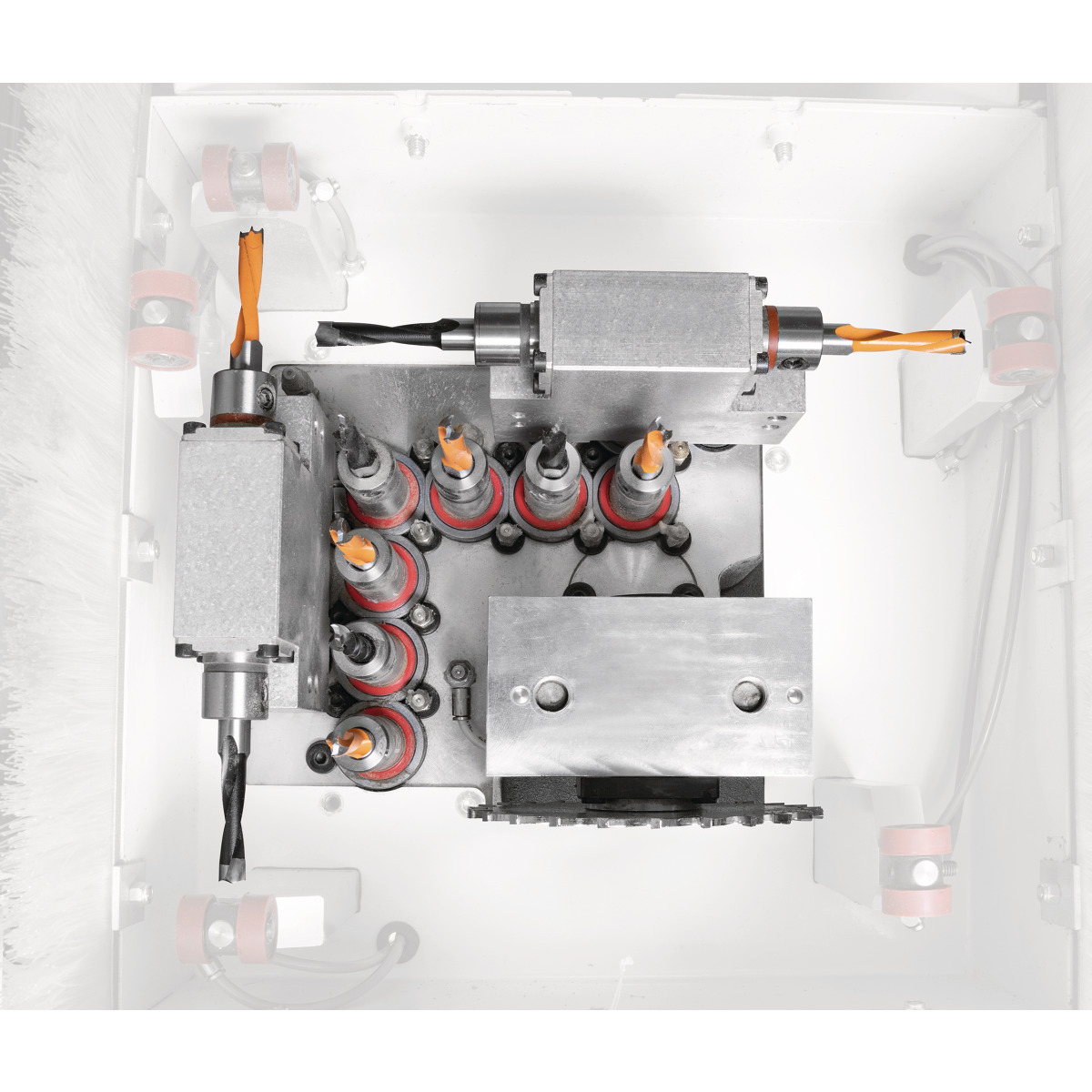 - Ein Bohrkopf mit sieben Vertikal-, vier Horizontalspindeln und einem Nutsägeaggregat