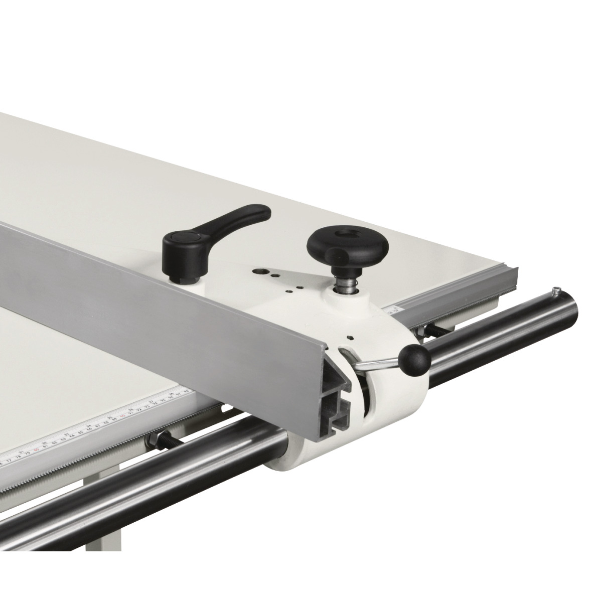 - Präziser Formatschiebeschlitten aus eloxiertem Aluminium – leichtgängig geführt über hochwertiges Kugelkontaktsystem