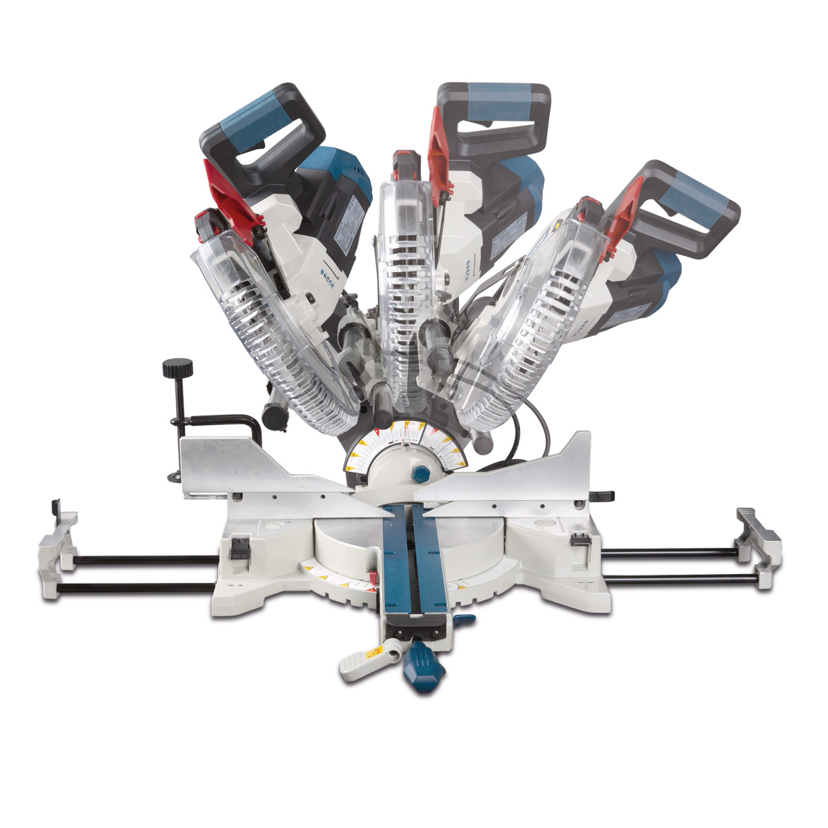 - Beidseitige Verlängerung der Werkstückauflage mit Klappanschlägen für repetitives Arbeiten