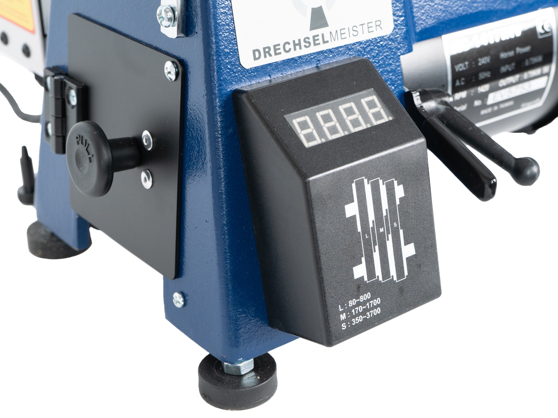 - 3 Riemenstufen / Geschwindigkeiten stufenlos regulierbar: 80 – 800 / 170 – 1.700 / 350 – 3.700 U/min