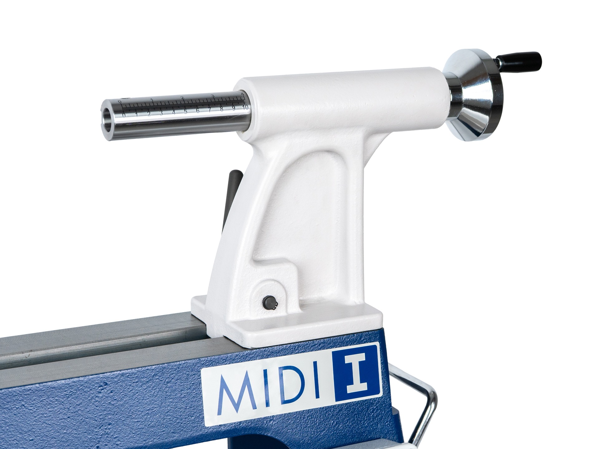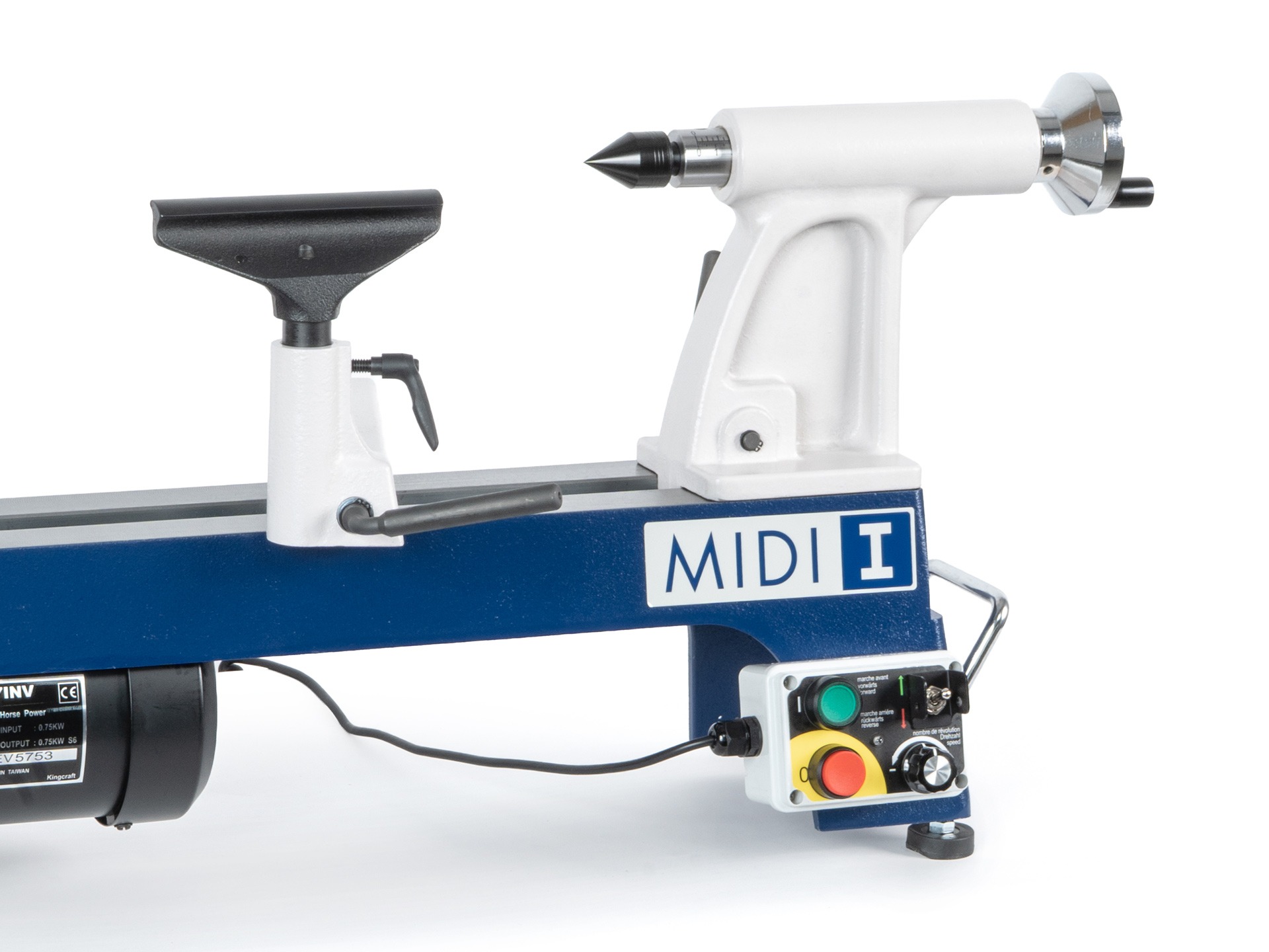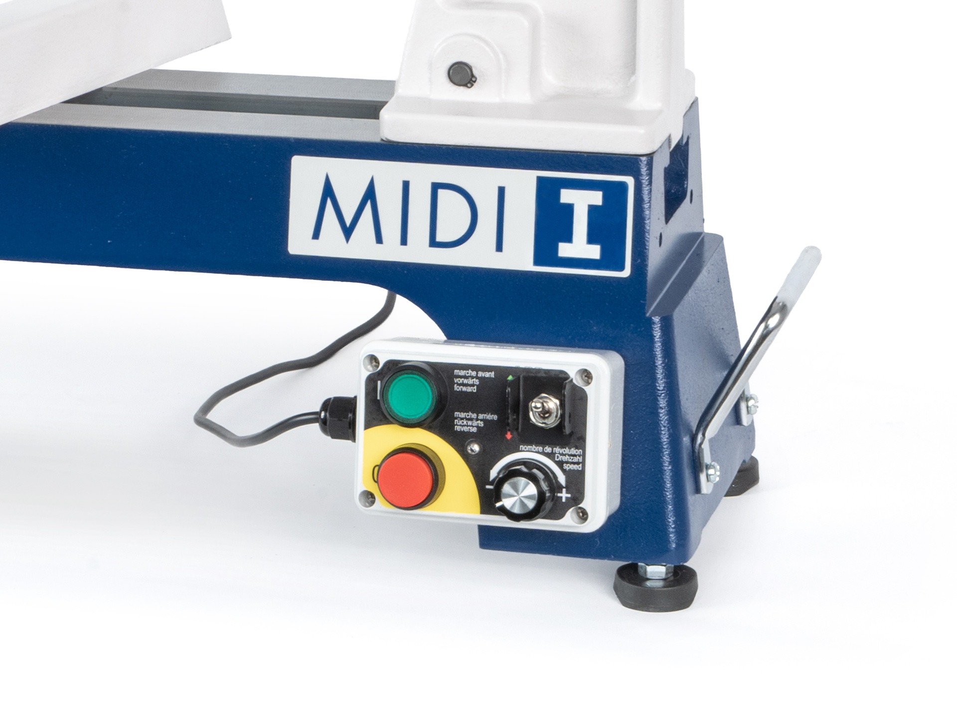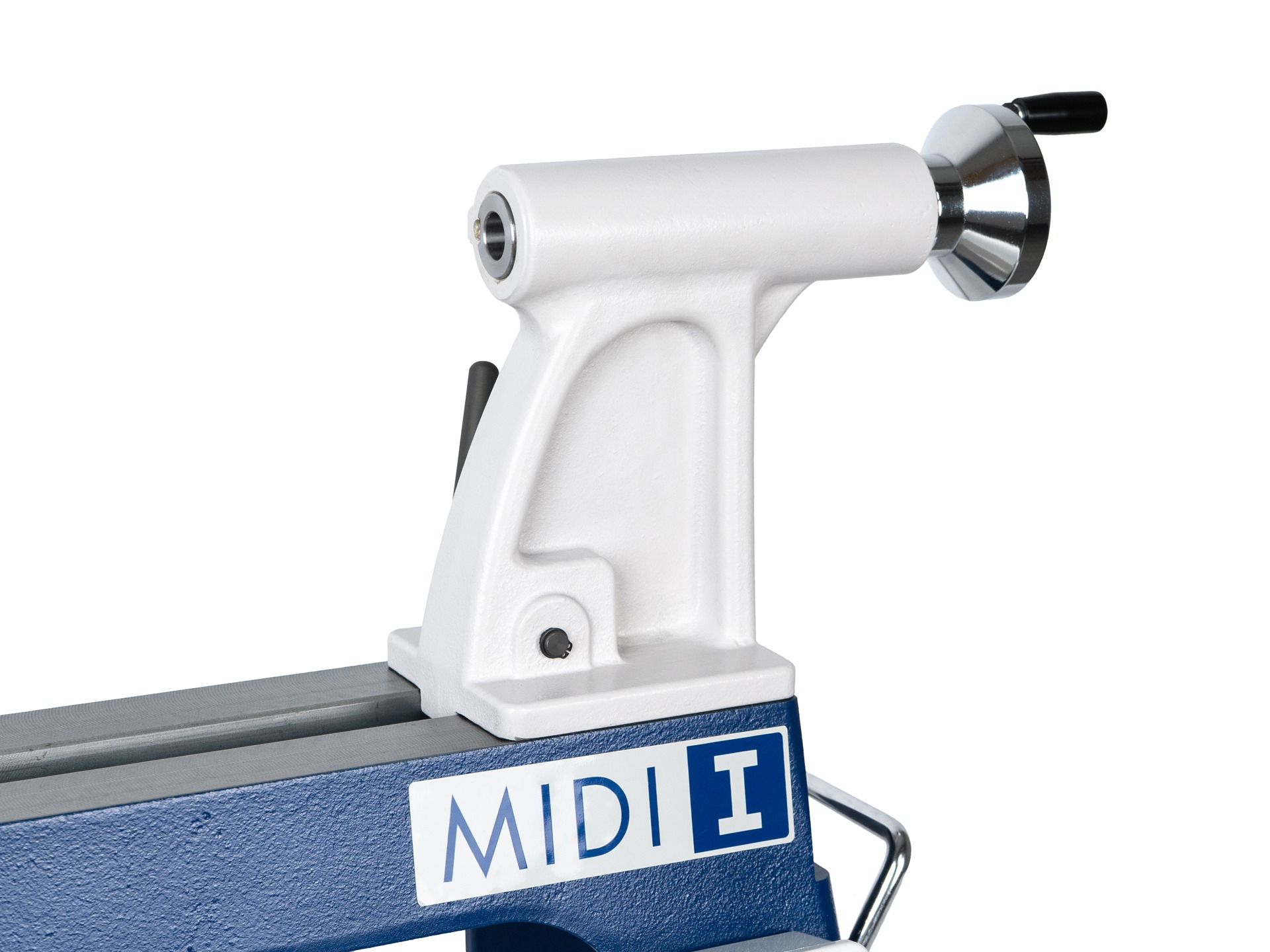 Die MIDI 1 ist die überarbeitete Version des Tischdrechselbank-Klassikers MIDITEC FU-175, welche sich in unzähligen Drechselwerkstätten bestens bewährt hat. Die neue Version behält die soliden Eigenschaften des Vorgängers bei und ergänzt diese mit modernen Sicherheitseinrichtungen. So verfügt die MIDI 1 nun über einen beleuchteten LED-Starttaster (leuchtet bei Maschinenbetrieb) und einer neuen Spindel mit M33 x 3,5 mm Gewinde und ASR-(Euro-)Ablaufsicherungsnut. Eine gelbe LED-Warnlampe leuchtet bei aktiviertem Rückwärtslauf. Der Reitstock ist nun massiv ausgeführt und mit einer Trapezgewindespindel ausgestattet. Die Pinole mit einem Pinolenweg von 100 mm (!) eignet sich jetzt auch optimal zum Bohren von Werkstücken. Das Handrad am Reitstock ist mit einer gelagerten Kurbel ausgestattet.