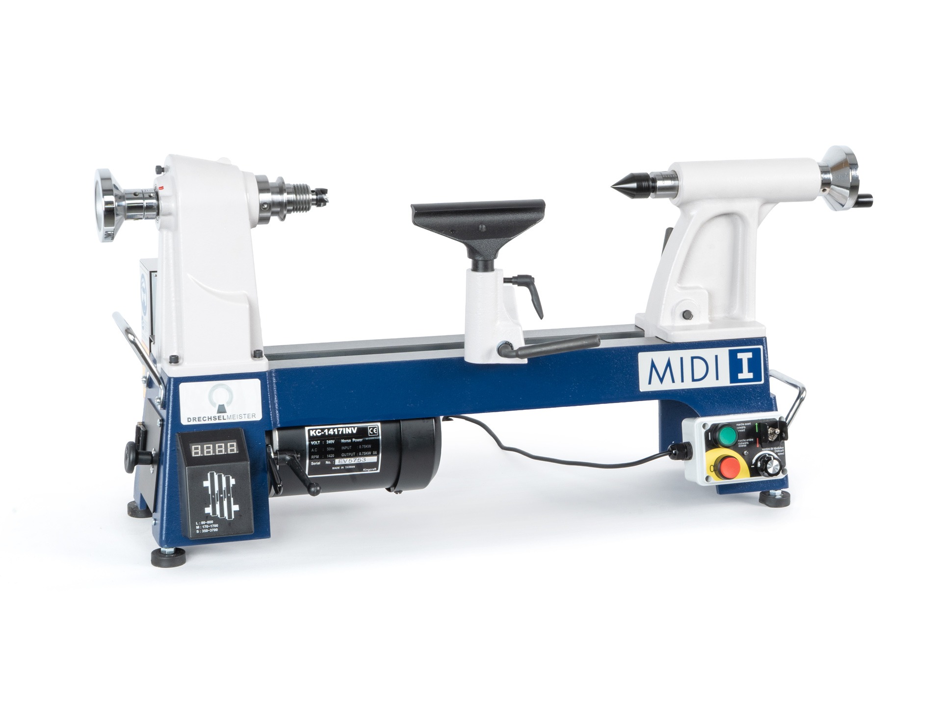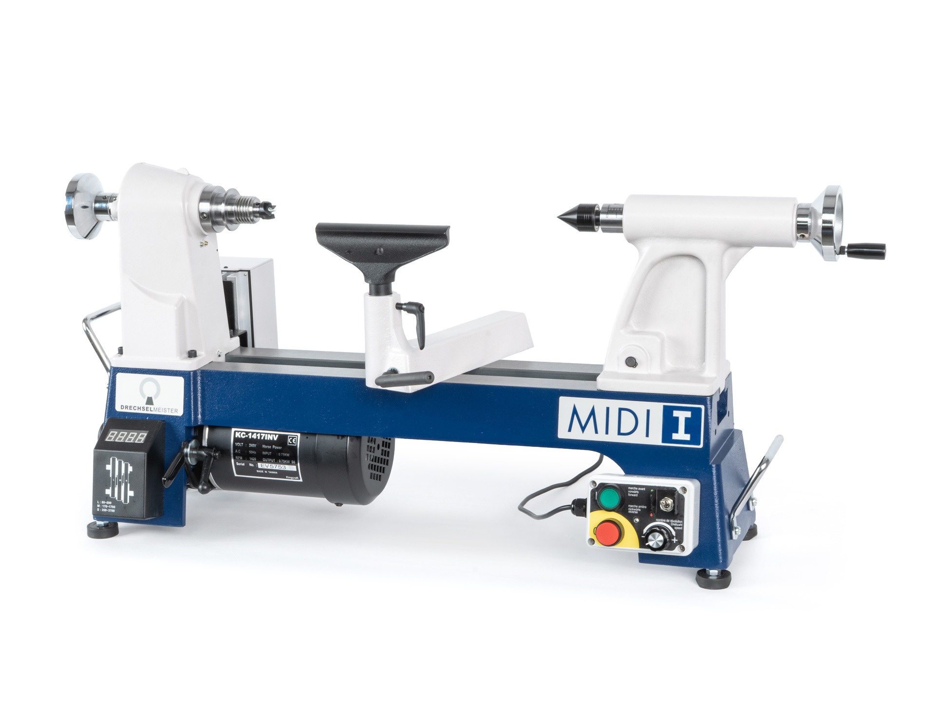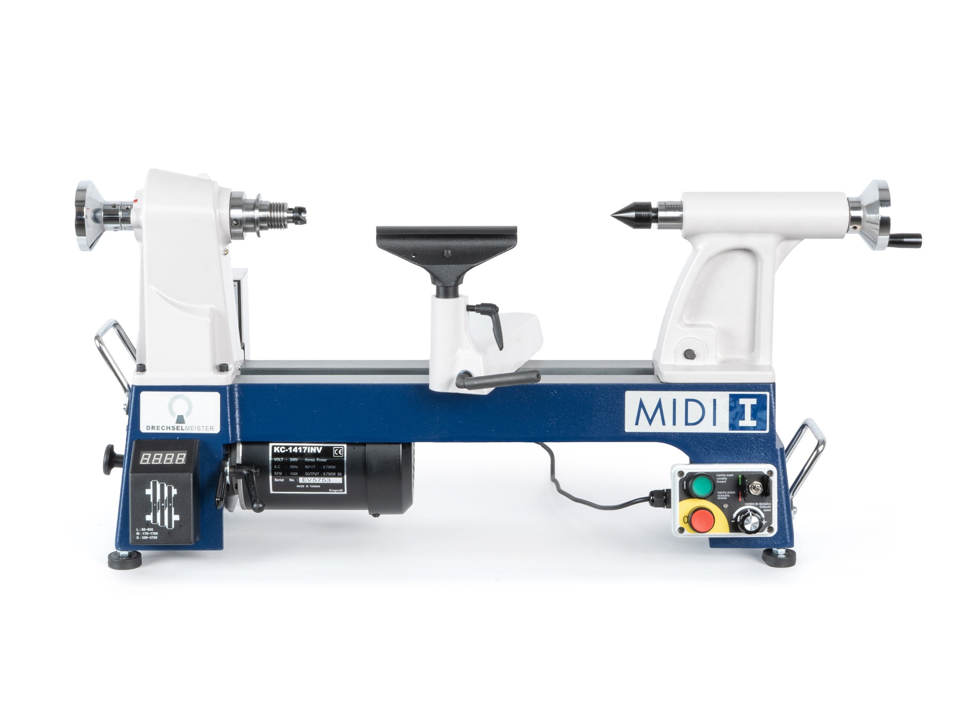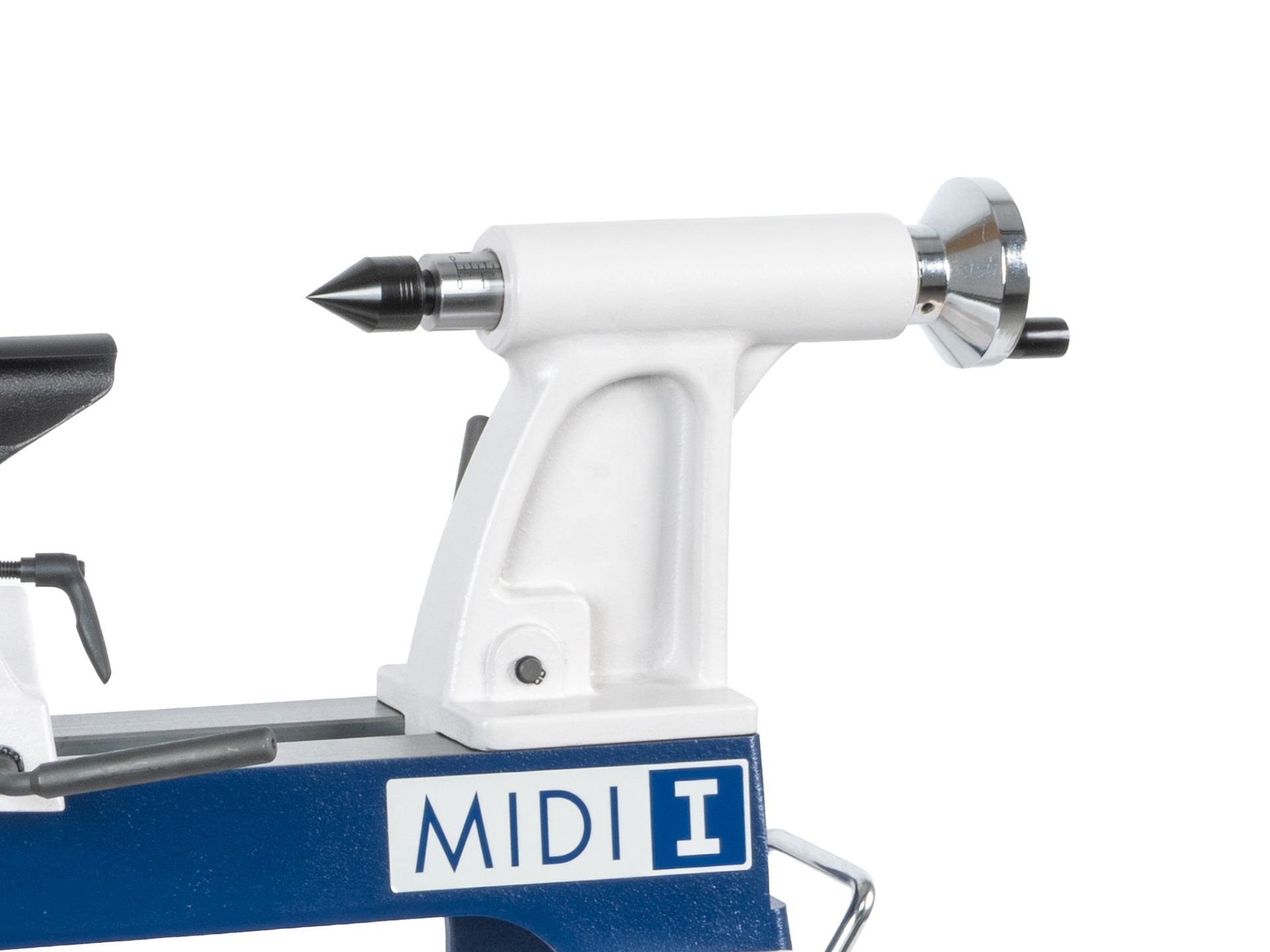 Die MIDI 1 ist die überarbeitete Version des Tischdrechselbank-Klassikers MIDITEC FU-175, welche sich in unzähligen Drechselwerkstätten bestens bewährt hat. Die neue Version behält die soliden Eigenschaften des Vorgängers bei und ergänzt diese mit modernen Sicherheitseinrichtungen. So verfügt die MIDI 1 nun über einen beleuchteten LED-Starttaster (leuchtet bei Maschinenbetrieb) und einer neuen Spindel mit M33 x 3,5 mm Gewinde und ASR-(Euro-)Ablaufsicherungsnut. Eine gelbe LED-Warnlampe leuchtet bei aktiviertem Rückwärtslauf. Der Reitstock ist nun massiv ausgeführt und mit einer Trapezgewindespindel ausgestattet. Die Pinole mit einem Pinolenweg von 100 mm (!) eignet sich jetzt auch optimal zum Bohren von Werkstücken. Das Handrad am Reitstock ist mit einer gelagerten Kurbel ausgestattet.