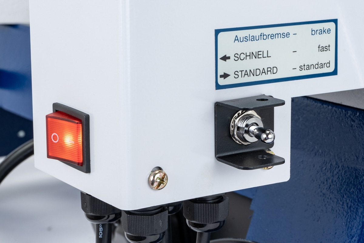 - NEU: Mit 2-stufigem Bremsschalter "schnell"/"standard" (Stufe "schnell" ist ideal für schnellen STOP/START z.B. bei kleinen Werkstücken wie Kugelschreibern)