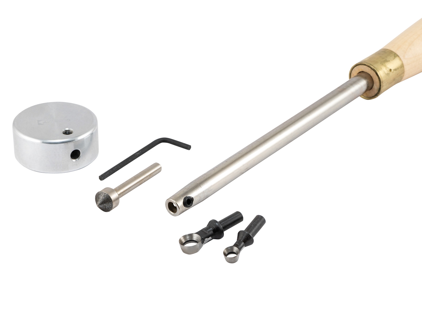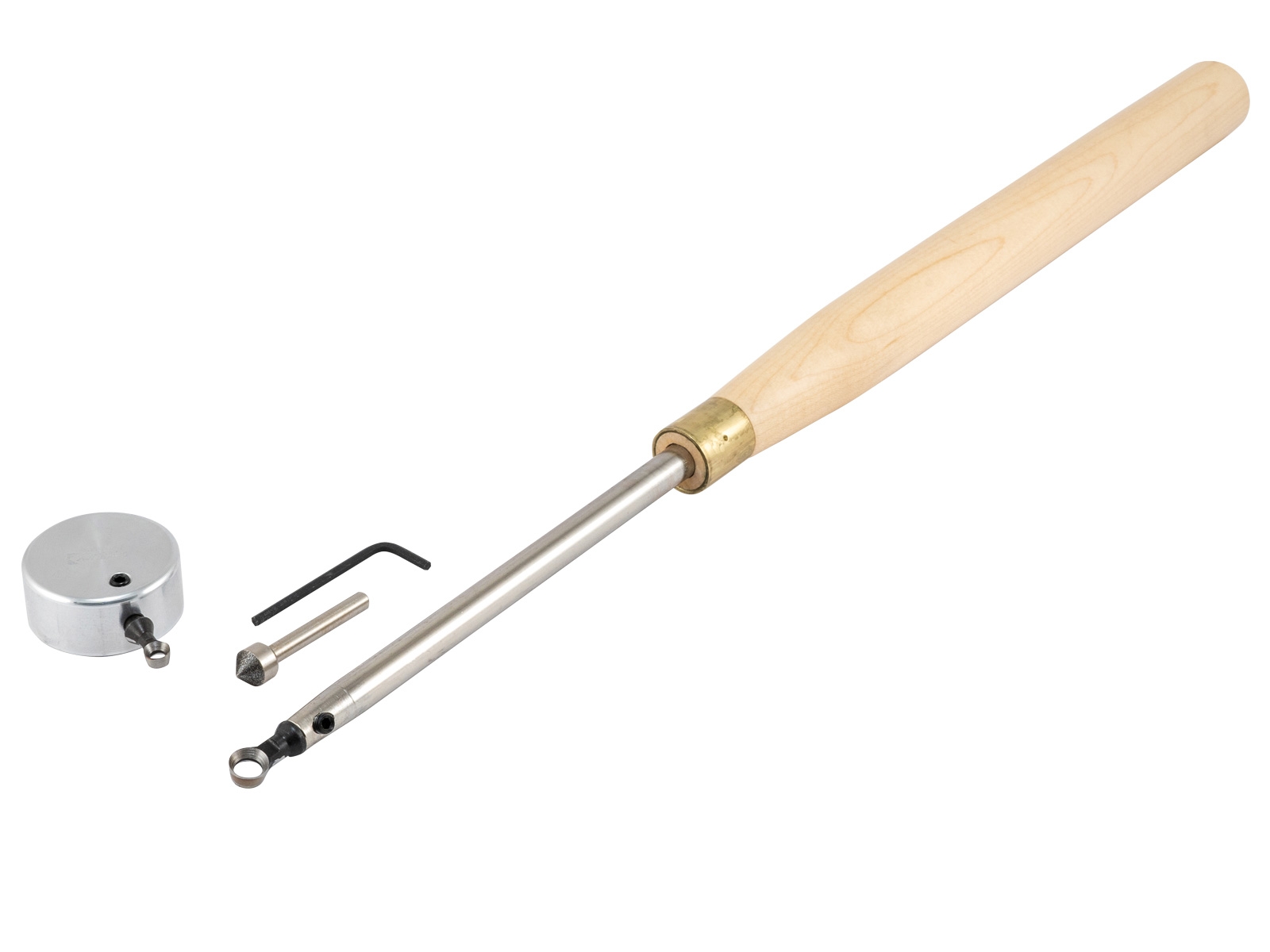 - Handgriff aus lackiertem Naturholz (ca. 385 mm lang) mit Werkzeugträger (Gesamtlänge mit Werkzeugträger: ca. 570 mm)