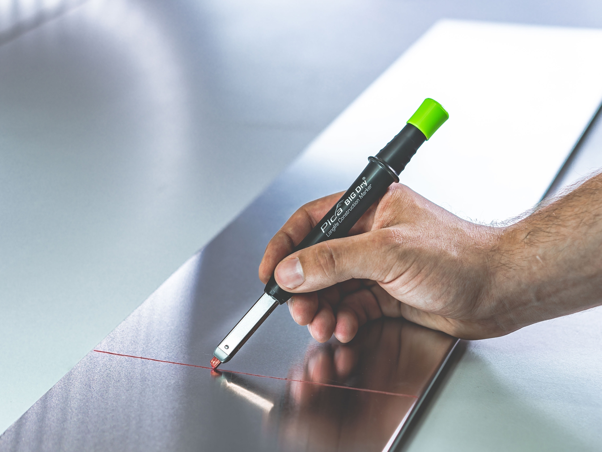 Pica-BIG-Dry Longlife Construction Marker - Der einzigartige nachfüllbare Zimmermanns-Druckbleistift.Dieser robuste Zimmermanns-Druckbleistift wird wie sein kleiner Bruder ebenfalls in einem praktischen und fest sitzenden Köcher verwahrt. Dank dem stabilen Clip hält der Köcher fest in der Tasche und der Stift lässt sich mit einer Hand ziehen ohne unabsichtlich herauszufallen. Am Köcher ist ein Minenschärfer angebracht um bei feineren Markierungen die Mine zurecht zu schleifen. Spitzen muss man diesen Stift nie, einfach nachdrücken und es geht weiter. Der automatische Minenvorschub auf Knopfdruck funktioniert dank einer einzigartigen Druckmechanik in gut dosierbaren Schritten, die Konstruktion ist bestens gegen Staub- und Nässe geschützt. Die verschiedenen als Zubehör erhältlichen Minen sind ganz einfach von hinten Nachfüllbar und machen diesen Stift so langlebig und nachhaltig. Kurz um: DAS Markierungswerkzeug für professionelle Handwerker.Vorteile und Nutzen:Robuste Rechteck Minen mit 2 x 5 mm Querschnitt - ideal zum AnzeichnenExtrem nachhaltig dank Nachfüllbarkeit und extrem langer MarkierleistungEinzigartige Druckmechanik mit maximalem Staub- und NässeschutzSeine For all Graphitmine 2B markiert auf fast allen Material-Oberflächen, egal ob trocken, feucht, glatt, rau oder staubigVielfältigste Einsatzmöglichkeiten dank spezieller Ersatz-Minen: für helle oder dunkle Oberflächen, in wasserlöslich oder wasserfestVon glatten Flächen feucht abwischbarPraktischer Köcherschoner mit Spezial-Clip, für perfekte Ein-Hand-BedienungPatentiert: Der integrierte Minenschärfer im Köcherschoner - immer sofort zur HandHigh-Tech-Druckmechanik für automatischen Minenvorschub im EdelstahlrohrMinen ganz einfach von hinten nachfüllbar Lieferumfang 1 Pica-BIG-Dry-Construction Marker1 Graphitmine (im Stift eingesetzt) ▶ Video ansehen