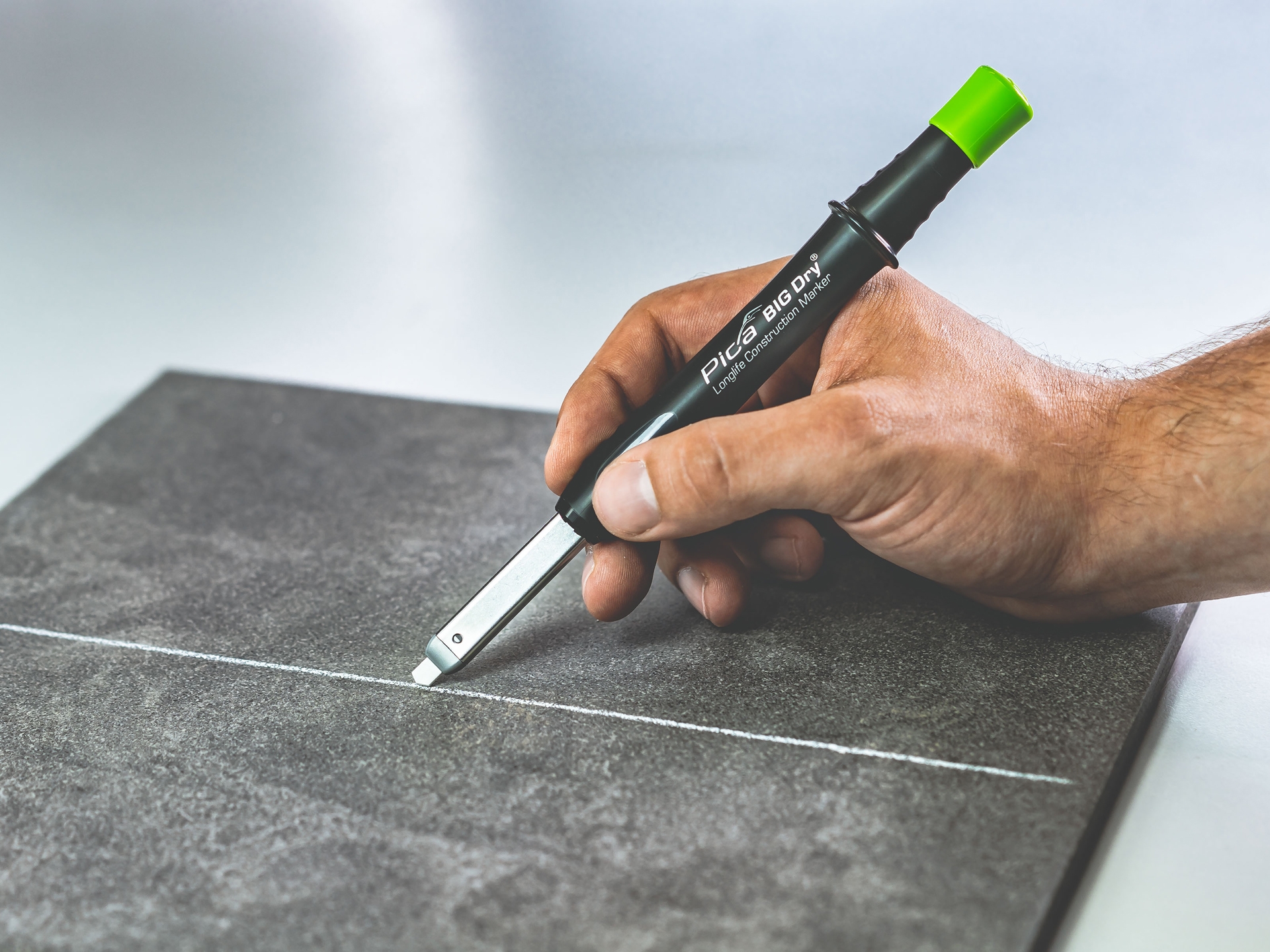 Pica-BIG-Dry Longlife Construction Marker - Der einzigartige nachfüllbare Zimmermanns-Druckbleistift - im Set mit 12 FOR ALL Ersatzminen.Dieser robuste Zimmermanns-Druckbleistift wird wie sein kleiner Bruder ebenfalls in einem praktischen und fest sitzenden Köcher verwahrt. Dank dem stabilen Clip hält der Köcher fest in der Tasche und der Stift lässt sich mit einer Hand ziehen ohne unabsichtlich herauszufallen. Am Köcher ist ein Minenschärfer angebracht um bei feineren Markierungen die Mine zurecht zu schleifen. Spitzen muss man diesen Stift nie, einfach nachdrücken und es geht weiter. Der automatische Minenvorschub auf Knopfdruck funktioniert dank einer einzigartigen Druckmechanik in gut dosierbaren Schritten, die Konstruktion ist bestens gegen Staub- und Nässe geschützt. Die verschiedenen als Zubehör erhältlichen Minen sind ganz einfach von hinten Nachfüllbar und machen diesen Stift so langlebig und nachhaltig. Kurz um: DAS Markierungswerkzeug für professionelle Handwerker.Vorteile und Nutzen:Robuste Rechteck Minen mit 2 x 5 mm Querschnitt - ideal zum AnzeichnenExtrem nachhaltig dank Nachfüllbarkeit und extrem langer MarkierleistungEinzigartige Druckmechanik mit maximalem Staub- und NässeschutzSeine For all Graphitmine 2B markiert auf fast allen Material-Oberflächen, egal ob trocken, feucht, glatt, rau oder staubigVielfältigste Einsatzmöglichkeiten dank spezieller Ersatz-Minen: für helle oder dunkle Oberflächen, in wasserlöslich oder wasserfestVon glatten Flächen feucht abwischbarPraktischer Köcherschoner mit Spezial-Clip, für perfekte Ein-Hand-BedienungPatentiert: Der integrierte Minenschärfer im Köcherschoner - immer sofort zur HandHigh-Tech-Druckmechanik für automatischen Minenvorschub im EdelstahlrohrMinen ganz einfach von hinten nachfüllbar Lieferumfang 1 Pica-BIG-Dry-Construction Marker1 Graphitmine (im Stift eingesetzt)4 Stk. Graphitmine 2 x 5 x 150 mm4 Stk. Mine in rot 2 x 5 x 150 mm4 Stk. Mine in weiß 2 x 5 x 150 mmin der Minen-Aufbewahrungsbox ▶ Video ansehen