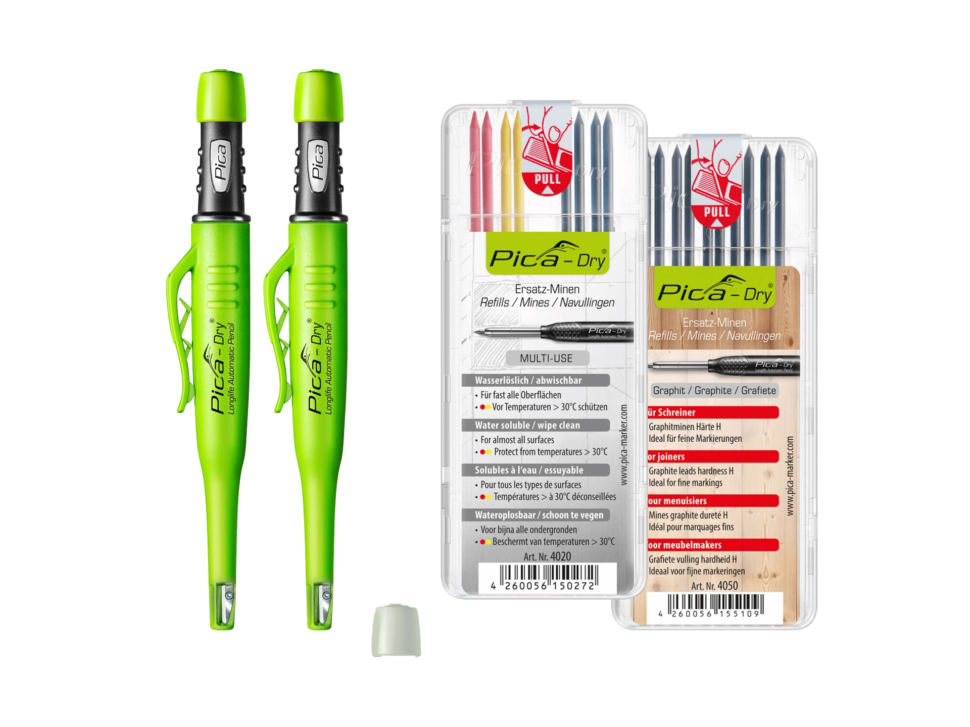 2x Pica-Dry Longlife-Automatic Pencil, 10x Grafitminen H, 10x wasserlösliche Multi-Minen und eine weiße Endkappe endlich wieder in einer Vorteilsbox !