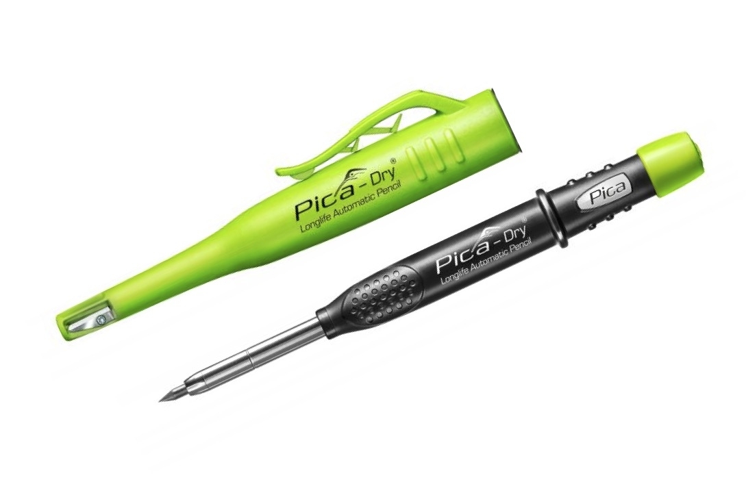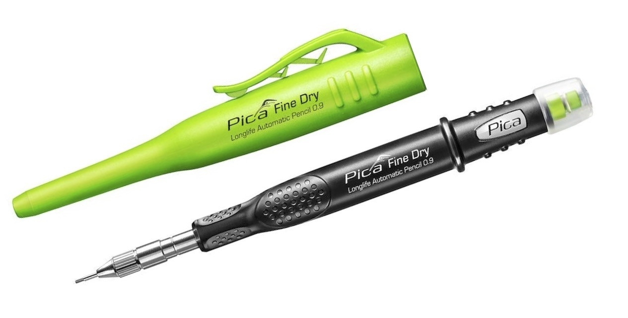 Der neue Pica-Fine-Dry Longlife Automatic Pencil mit seinen 0,9 mm Minen muss nicht gespitzt werden - speziell für feine und präzise Anrisse und Aufzeichnungen. Auch hier sind 1 Packung (24 Stück) passender Ersatzminen in Graphit H mit dabei.