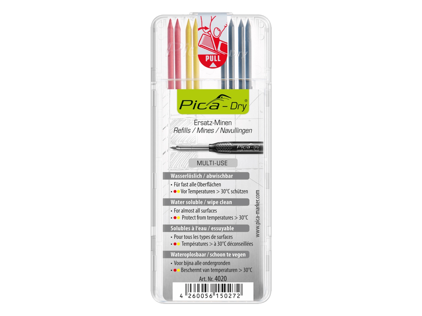 Wasserstrahlfeste original PICA Ersatzminen für den 3030 Longlife Automatic Pen.Diese wasserstrahlfesten MULTI-USE Minen eignen sich für fast alle Oberflächen, egal ob glatt, rauh, staubig, ölig, trocken, feucht, hell oder dunkel. Dank eben dieser Wasserstrahlfestigkeit ist diese Minenqualität perfekt für Nassschnitte von Fliesen, Steinen und ähnlichen Anwendungen. Achtung sie sind permanentmarkierend und somit nicht wieder abwischbar. Die Minen sind bereits fertig angespitzt und in einer transportsicheren Verpackung verstaut. Dieses spezielle Minen-Etui hat Dank seines Materialmixes aus PP / PC und der ausgeklügelten Bauweise eine extrem hohe Festigkeit und schützt die Minen bis zu ihrer Verwendung perfekt vor Beschädigungen.Vorteile und Nutzen:Für die meisten Oberflächen geeignetMarkieren zuverlässig auch bei Nassschnitten und der Witterung ausgesetzen UntergründenGrün, blau und weiß für starke Kontraste auf hellen und dunklen OberflächenChloridfreiVor Temperaturen über 40° schützenStabiles Aufbewahrungs-Etui damit die Minen bis zu ihrem Einsatz ganz bleiben Lieferumfang 3 Stk. Mine in blau3 Stk. Mine in grün2 Stk. Mine in weißin der Aufbewahrungsbox
