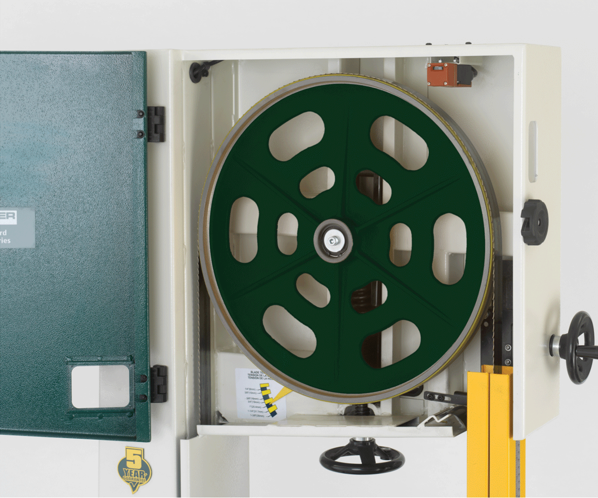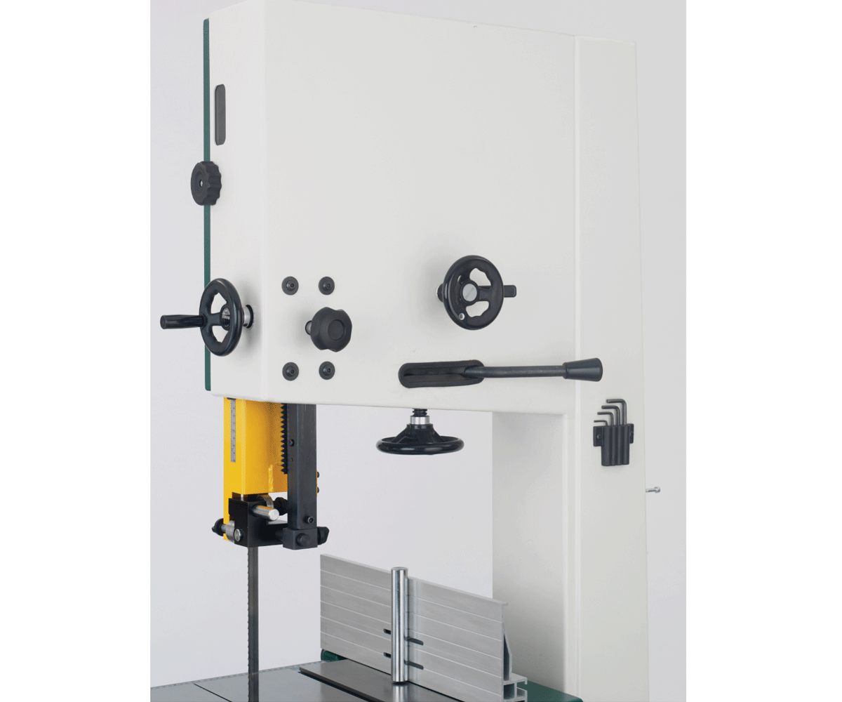 Ausgestattet mit einem Motor mit 1.500 Watt Ausgangsleistung (2 PS) und den schweren 450 mm Graugussumlenkrollen bietet die SABRE 450 viel Kraft und Leistung. Durch die einfache Bandsägeblattspannung mittels Spannhebel (Hebel auf der Rückseite der Bandsäge) kann das Bandsägeband schnell und einfach getauscht oder bei Bedarf entlastet werden. Diese Funktion macht auch den Bandwechsel zum Kinderspiel - das neue Band (vom gleichen Typ) hat, ohne viel zu schrauben, sofort die richtige Spannung.