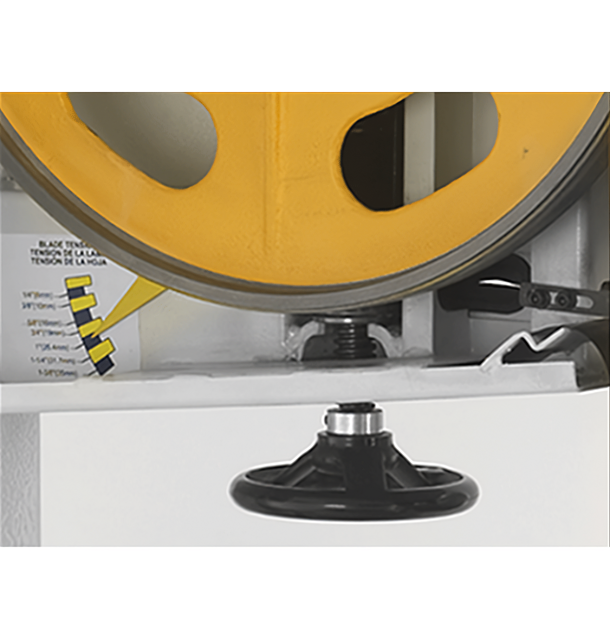 - Das große, massive Bandspannungselement erlaubt hohe Spannkräfte, die weder im Betrieb noch bei den maximal möglichen Bandbreiten nachgeben. So ist eine fehlerfreie Performance auch in bei extremen Schnittleistungen garantiert.