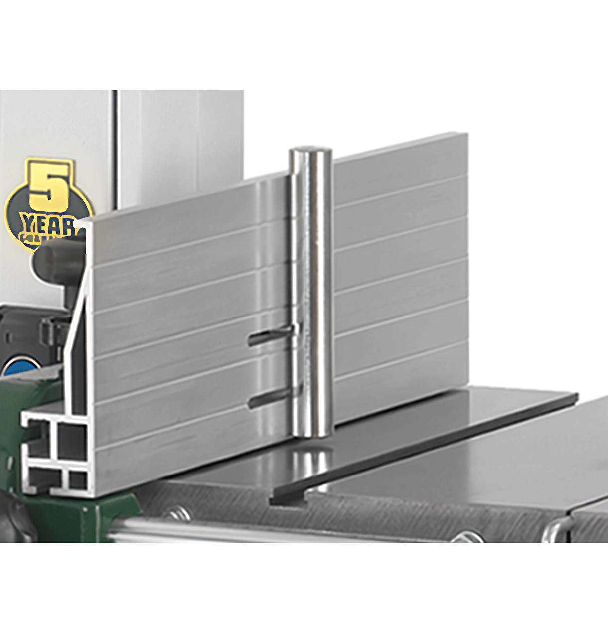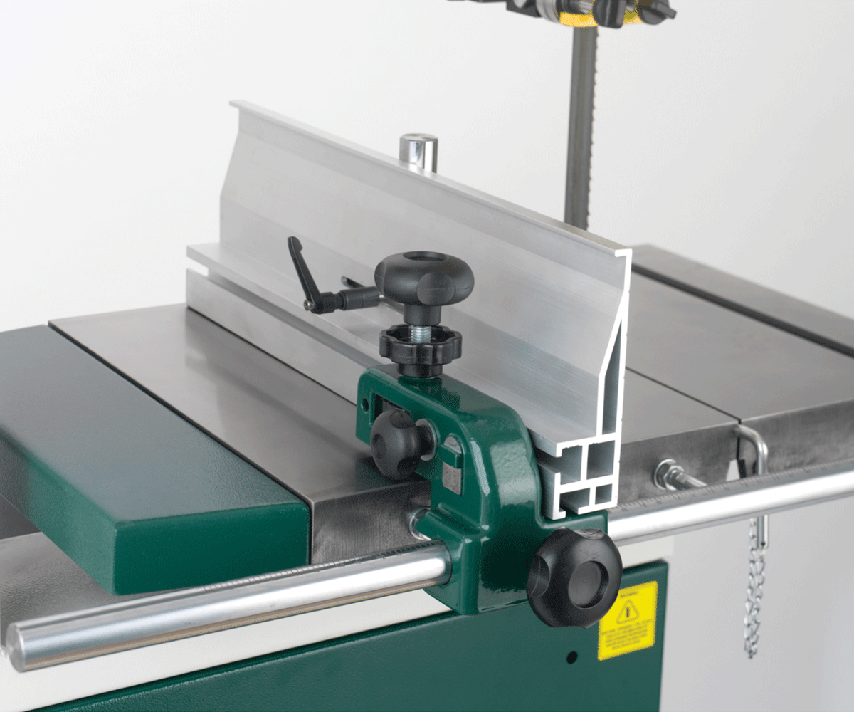 - Der robuste Aluminium-Anschlag kann auf der Anschlaghalterung doppelseitig montiert werden, sorgt für eine sichere Führung des Werkstücks und kann somit auch rechts vom Band montiert werden. Das Spannelement befindet sich dabei immer auf der entgegengesetzten Seite der Halterung.