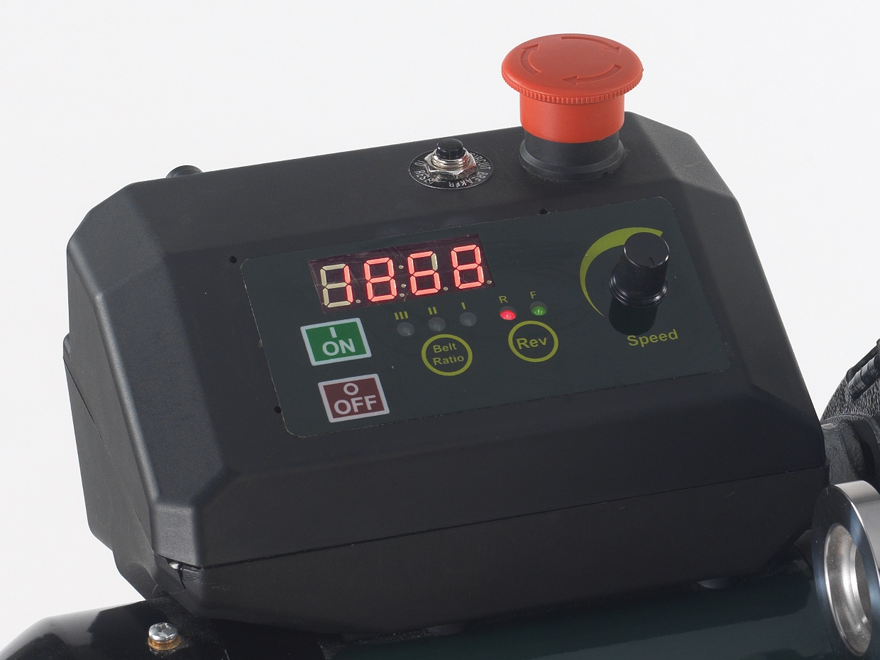 - Die Drehzahl wird über drei Riemenstufen und eine elektronische Drehzahlregelung eingestellt. Dies ermöglicht eine optimale Motorübersetzung für ausreichend Drehmoment im gewünschten Drehzahlbereich