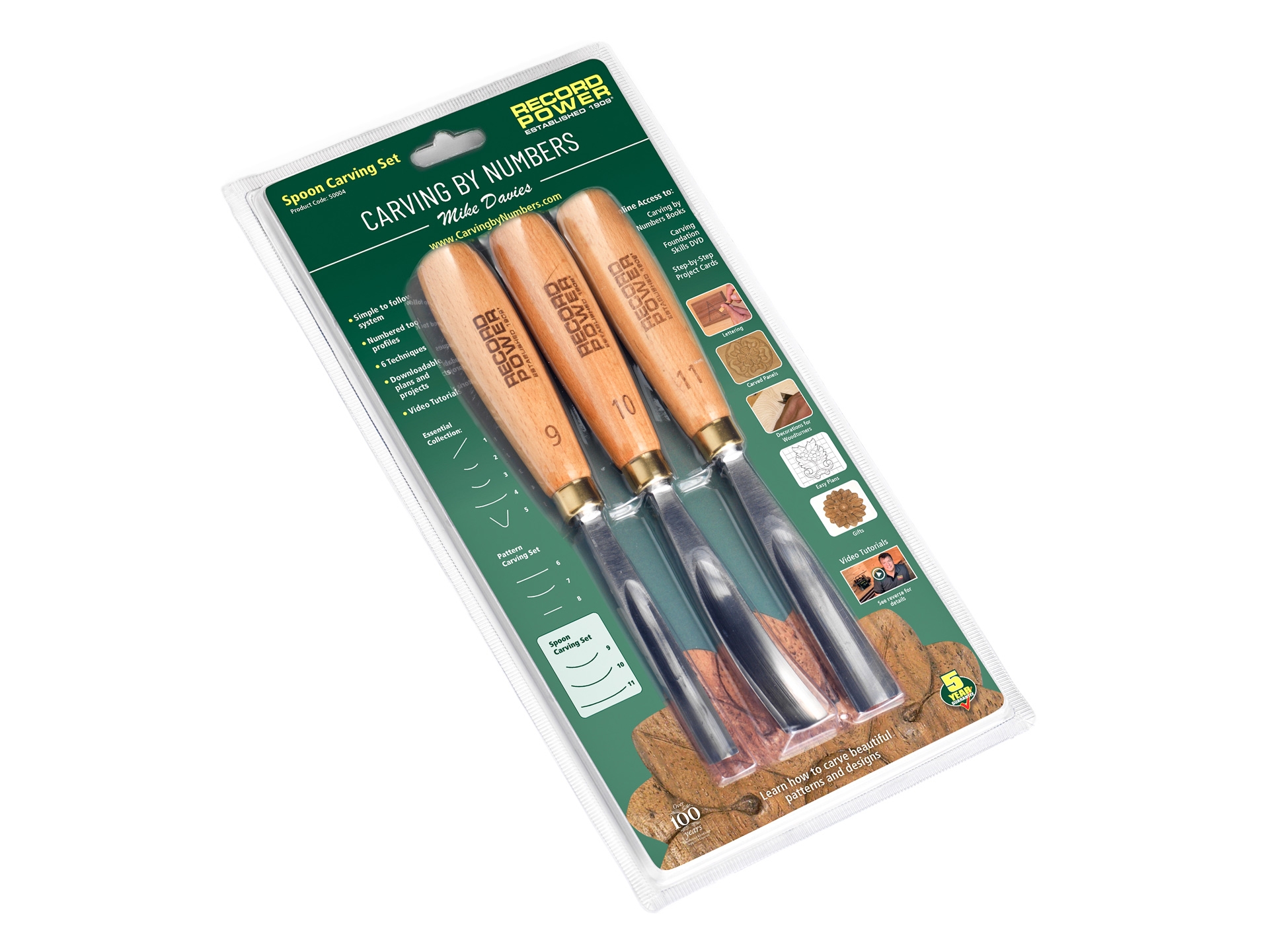 3-teiliges Schnitzeisen-SET zum Schnitzen von Löffeln, individueller Dekormotive und Designs. Mit der beigfügten Video Schritt-für-Schritt-Anleitungen von Mike Davies erlernen Sie das Schnitzen von Löffeln.