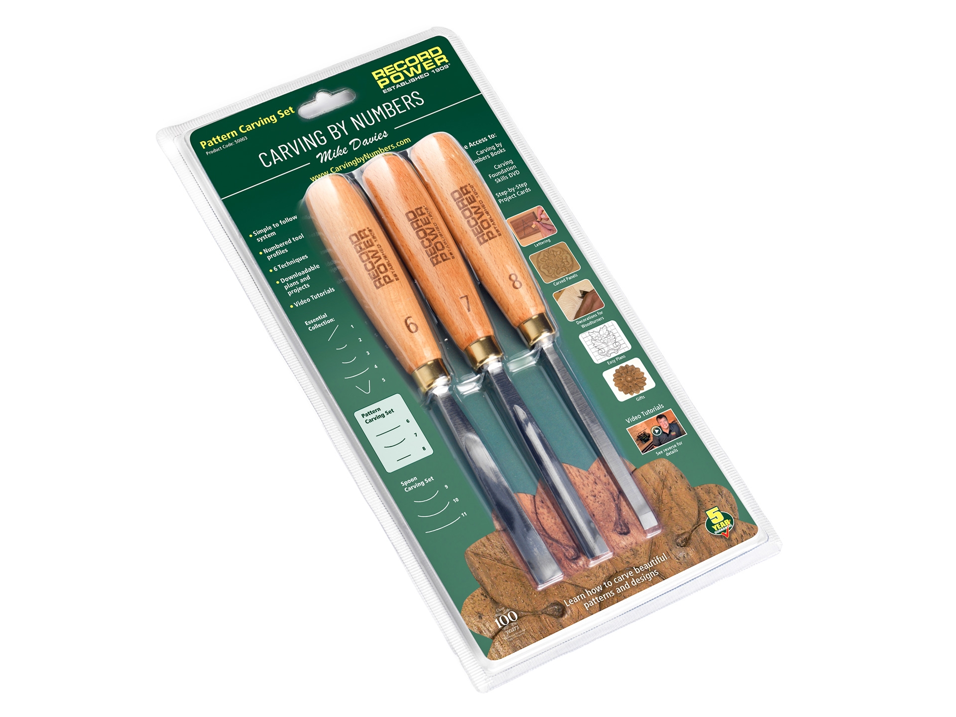 Kreieren Sie mit dem 3-teiligen Musterschnitzeisensatz eigene Designs und Muster oder schnitzen Sie nach Zahlen entprechend den beigfügten Schritt-für-Schritt-Anleitungen von Mike Davies.