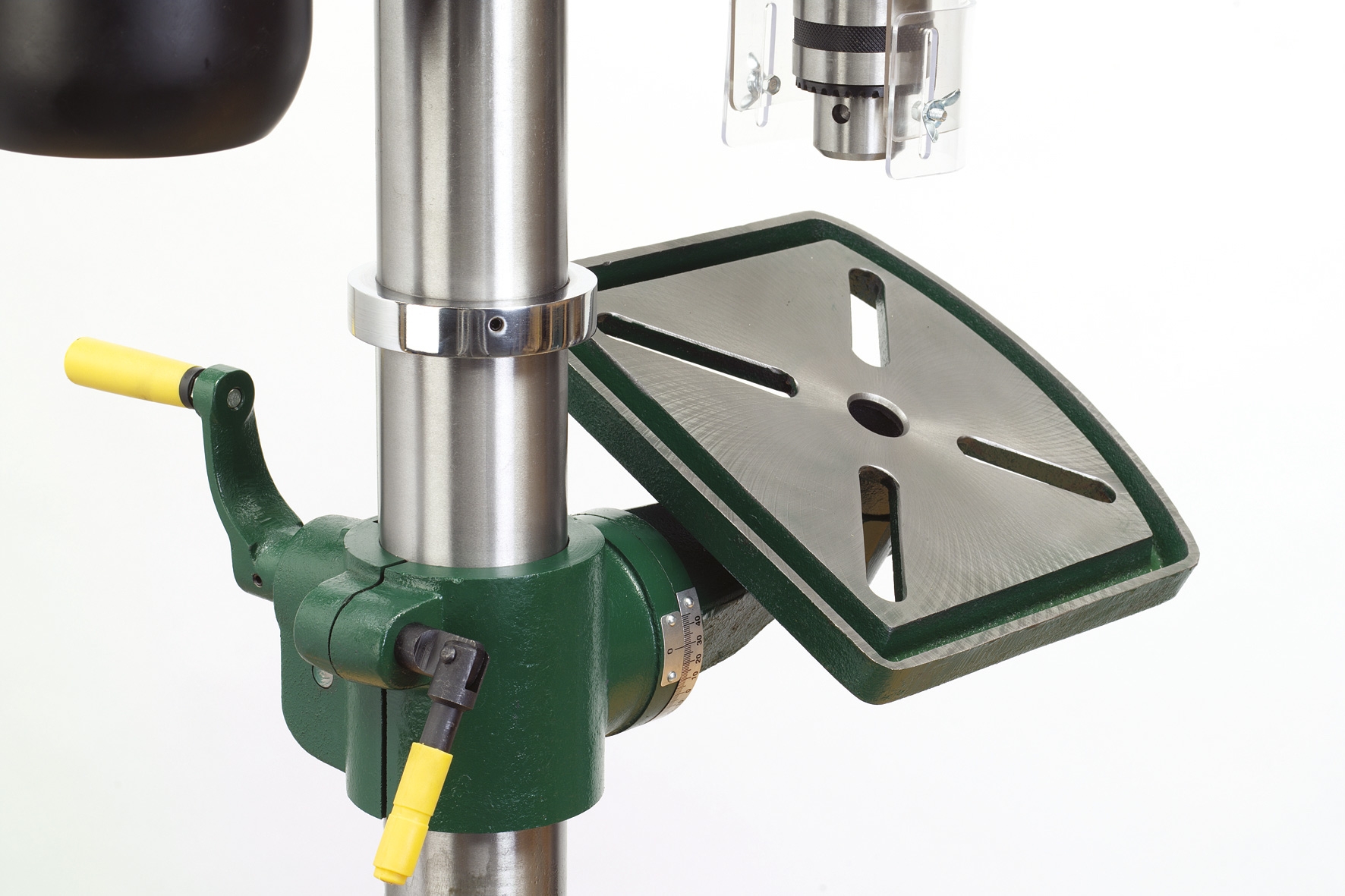 - Schnelle Höhenverstellung des Bohrtisches über die Handkurbel