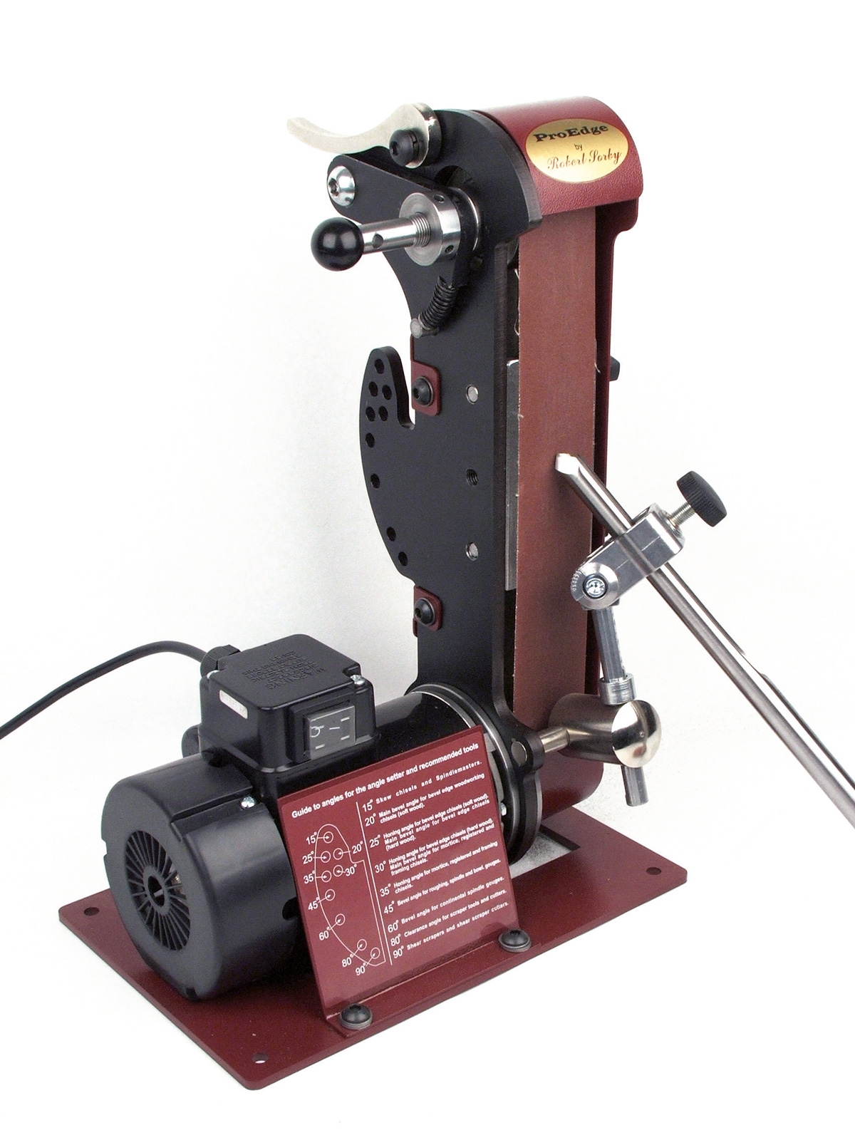 Die Schleifbandeinheit ist als Ganzes schwenkbar für optimalen Komfort und individuelle Einstellmöglichkeiten. Das Schärfgerät ist mit einem Gradraster-System mit 9 unterschiedlichen Einstellmöglichkeiten ausgestattet. Auf der Anzeigentafel lesen Sie bequem den richtigen Schärfwinkel für das jeweilige Werkzeug ab und stellen diesen in Sekundenschnelle ein. Die Winkelschnellverstellung garantiert exakte Wiederholbarkeit.