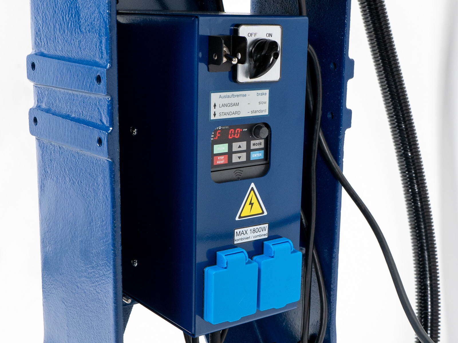 - Ein 2-stufiger Bremschalter am Frequenzumrichter-Kasten ermöglicht das Einstellen der Bremszeit (standard/langsam). Das bedeutet, die Bremszeit kann entsprechend erhöht werden, damit auch größere und unwuchte Werkstücke sicher abgebremst werden.