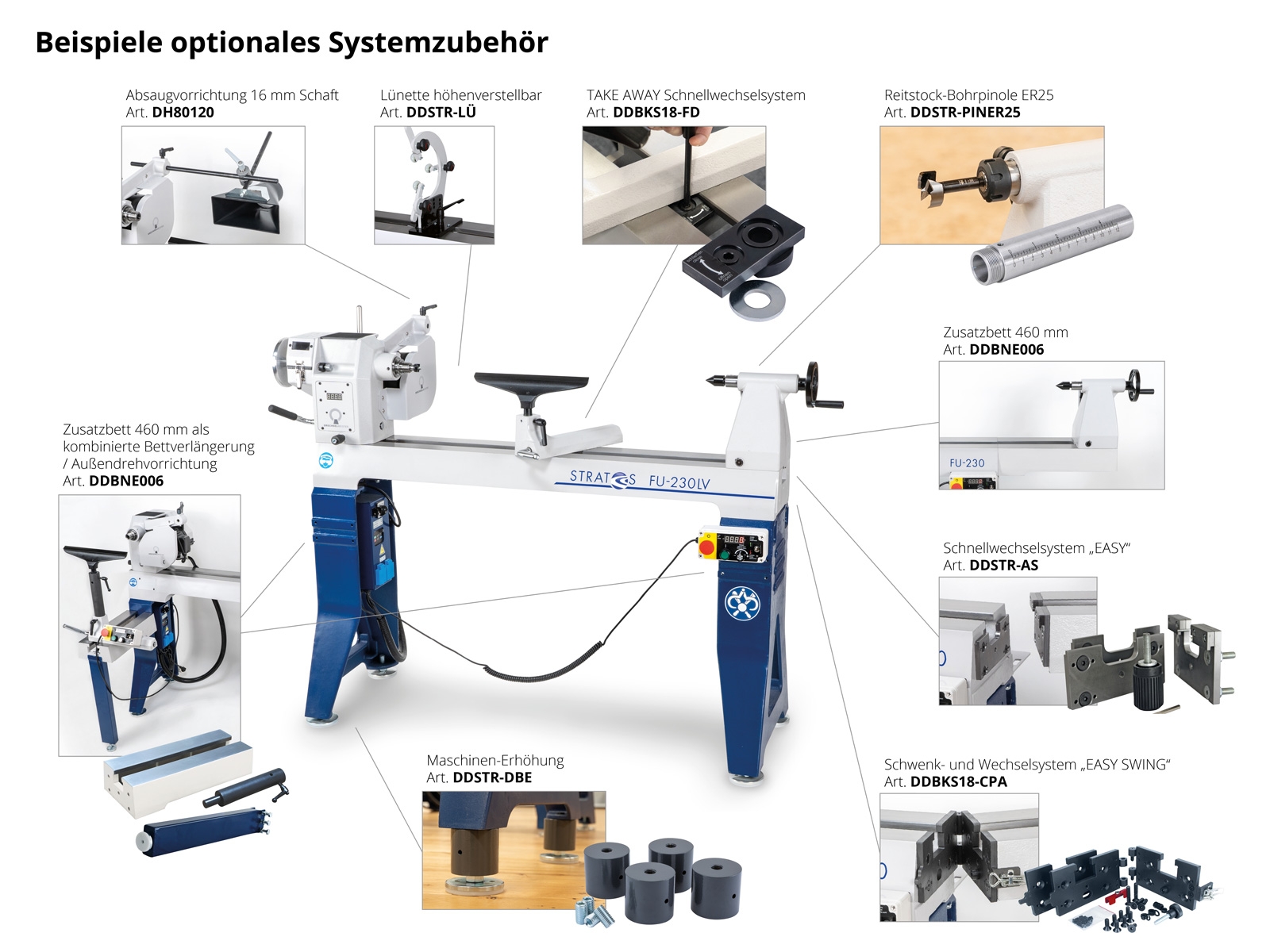 Sie vereint neueste Innovationen mit Altbewährtem. Die STRATOS FU-230 LV mit dem extra langen Bankbett ist eine für Einsteiger, fortgeschrittene Anwender, Profis und Künstler gleichermaßen geeignete Drechselbank zu einem optimalen Preis-Leistungsverhältnis und hat sich mittlerweile in unzähligen Werkstätten etabliert.