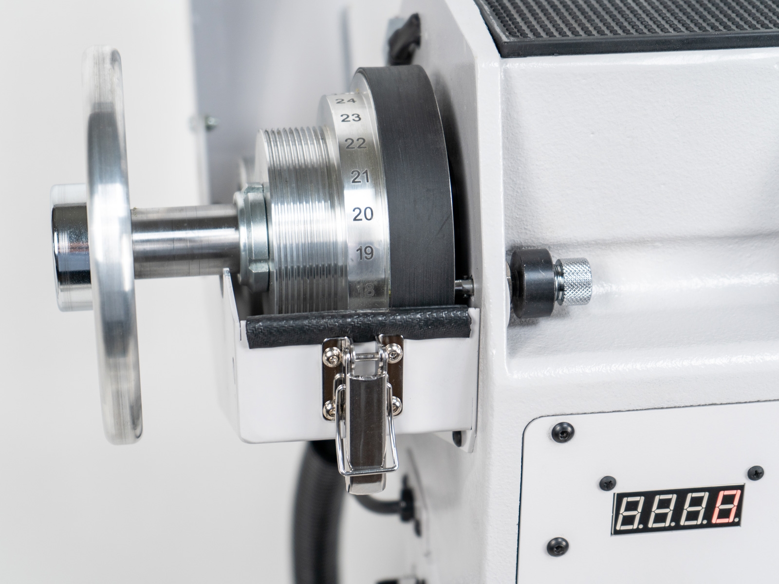 - Großer Drehgeschwindigkeitsbereich auf beiden Riemenscheiben; so kann ein großer Teil der Werkstücke ohne Riemenstufenwechsel bearbeitet werden
