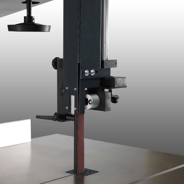 Die Schleifeinrichtung ist ein Zubehör, das in kürzester Zeit auf jede Bandsägemaschine montiert werden kann.Mit dieser Einrichtung können Sie Kanten mit verschiedenen Schleifschuhen (flach, rund) bearbeiten.