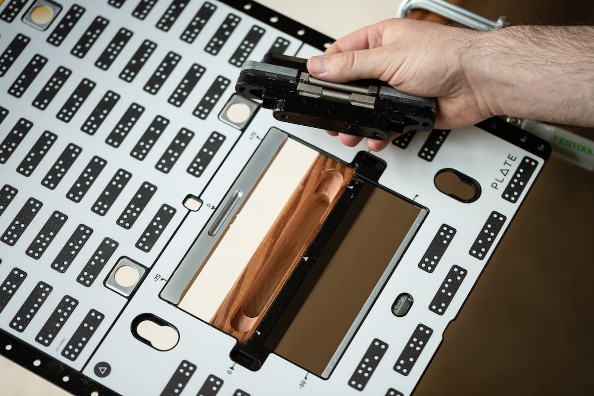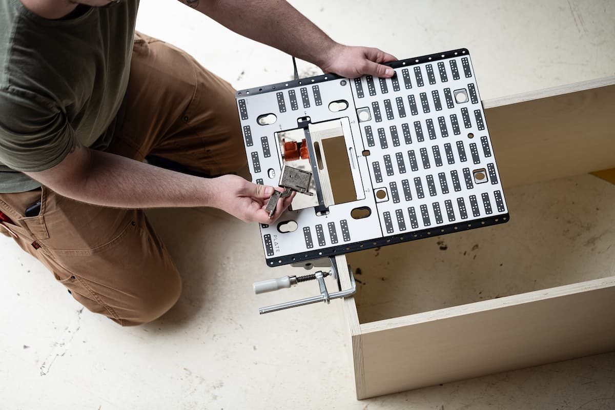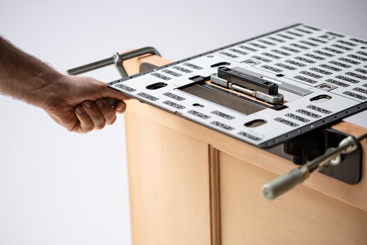 Shaper Plate macht das Einlassen von Beschlägen und wiederkehrenden Fräsarbeiten effizienter als je zuvor. Mit diesem Kantenanschlag lässt sich Plate noch flexibler einsetzen und an vertikale Werkstücke spannen. Der Anschlag kann mehreren Positionen an der Basis von Plate befestigt werden und besitzt sowohl eine Referenzfläche als auch eine Spannfläche. So lassen sich mit Origin einfach Türbänder installieren sowie anspruchsvolle Arbeiten an Kanten und Stirnseiten von Werkstücken umsetzen.