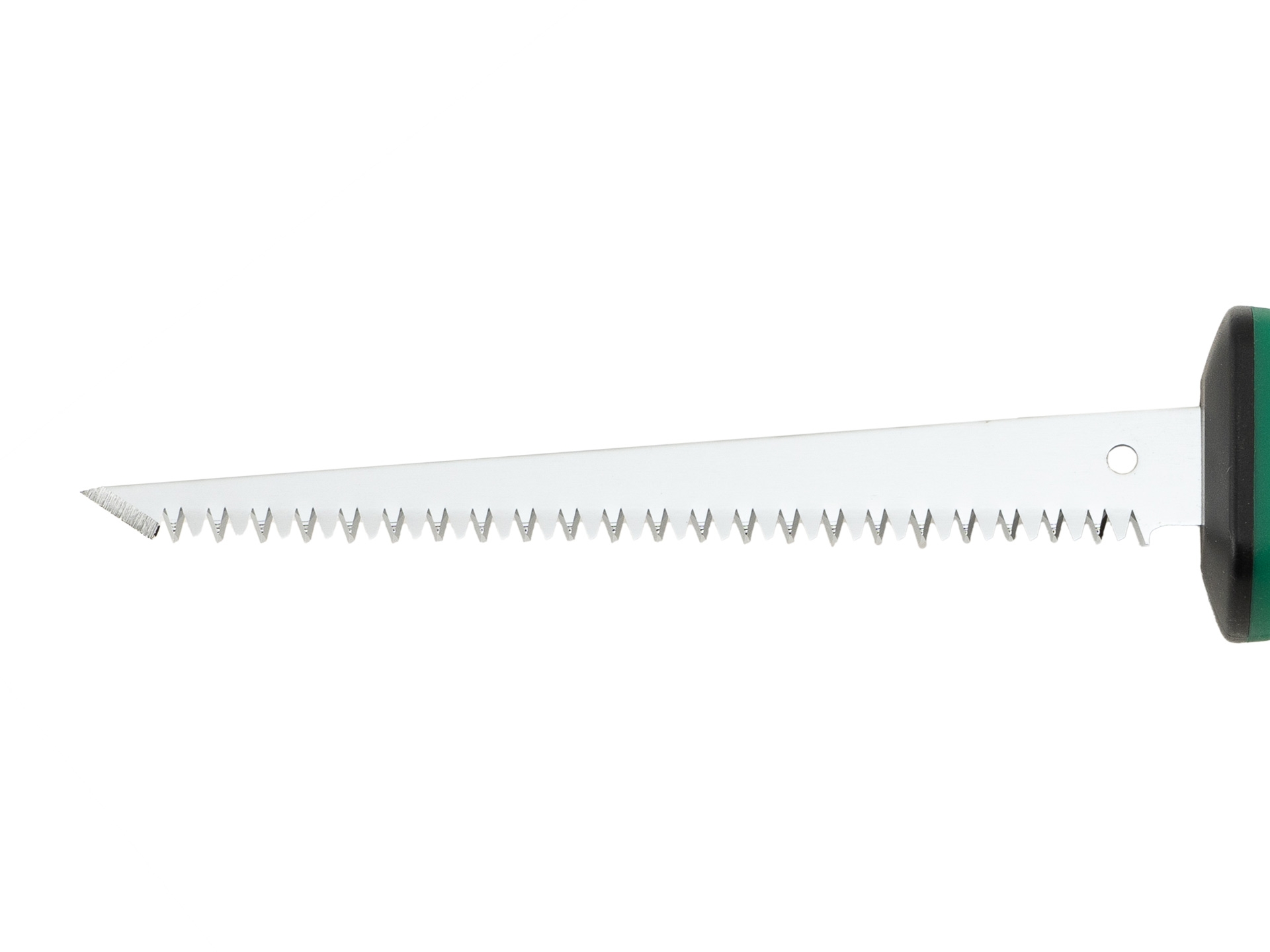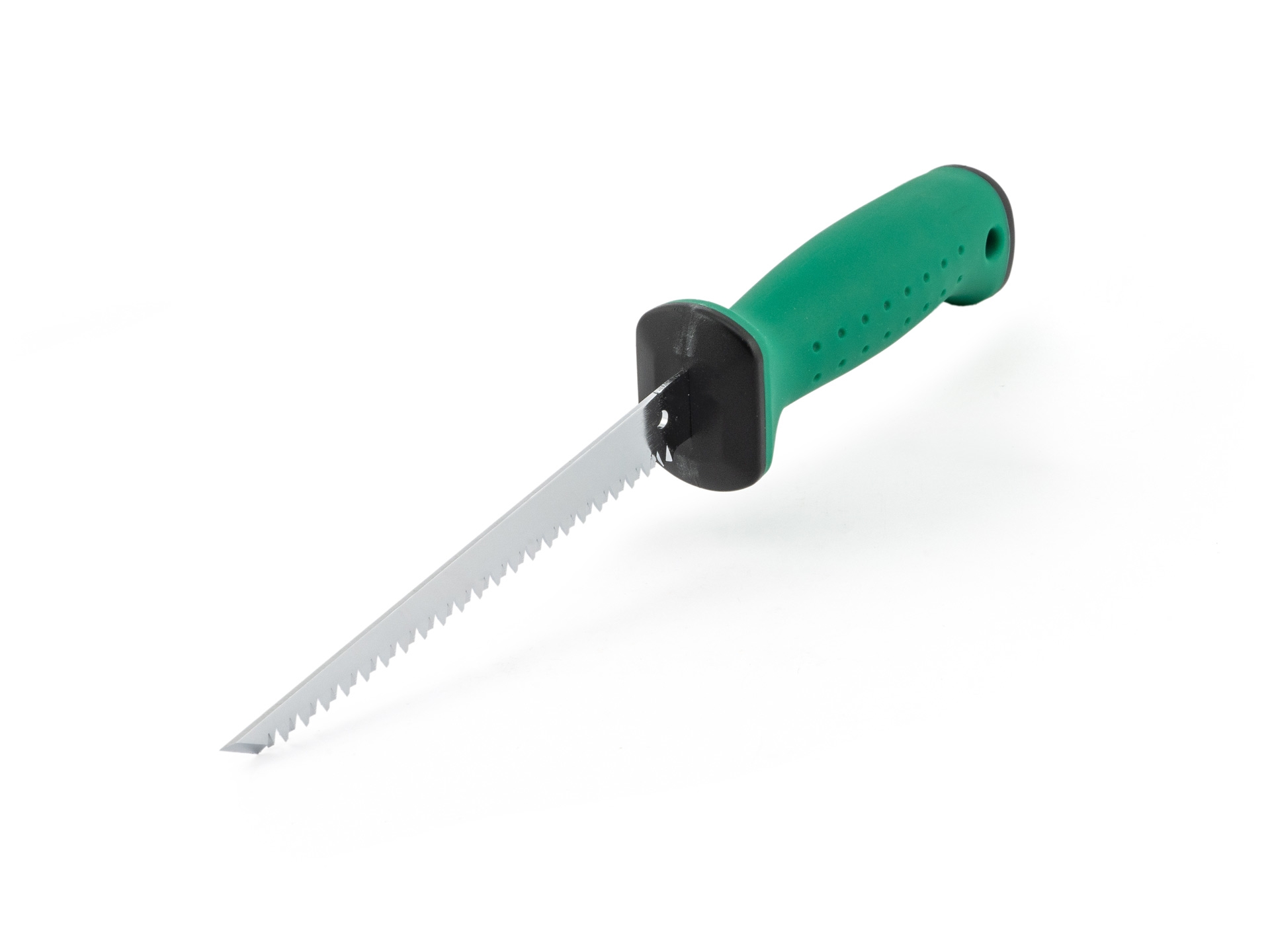 Eine kurze Kataba mit schmalem Sägeblatt und ergonomisch geformten "Softgrip" Kunststoffgriff. Vielseitig einsetzbar als Gipssäge, Dekupiersäge oder grobe Stichsäge.