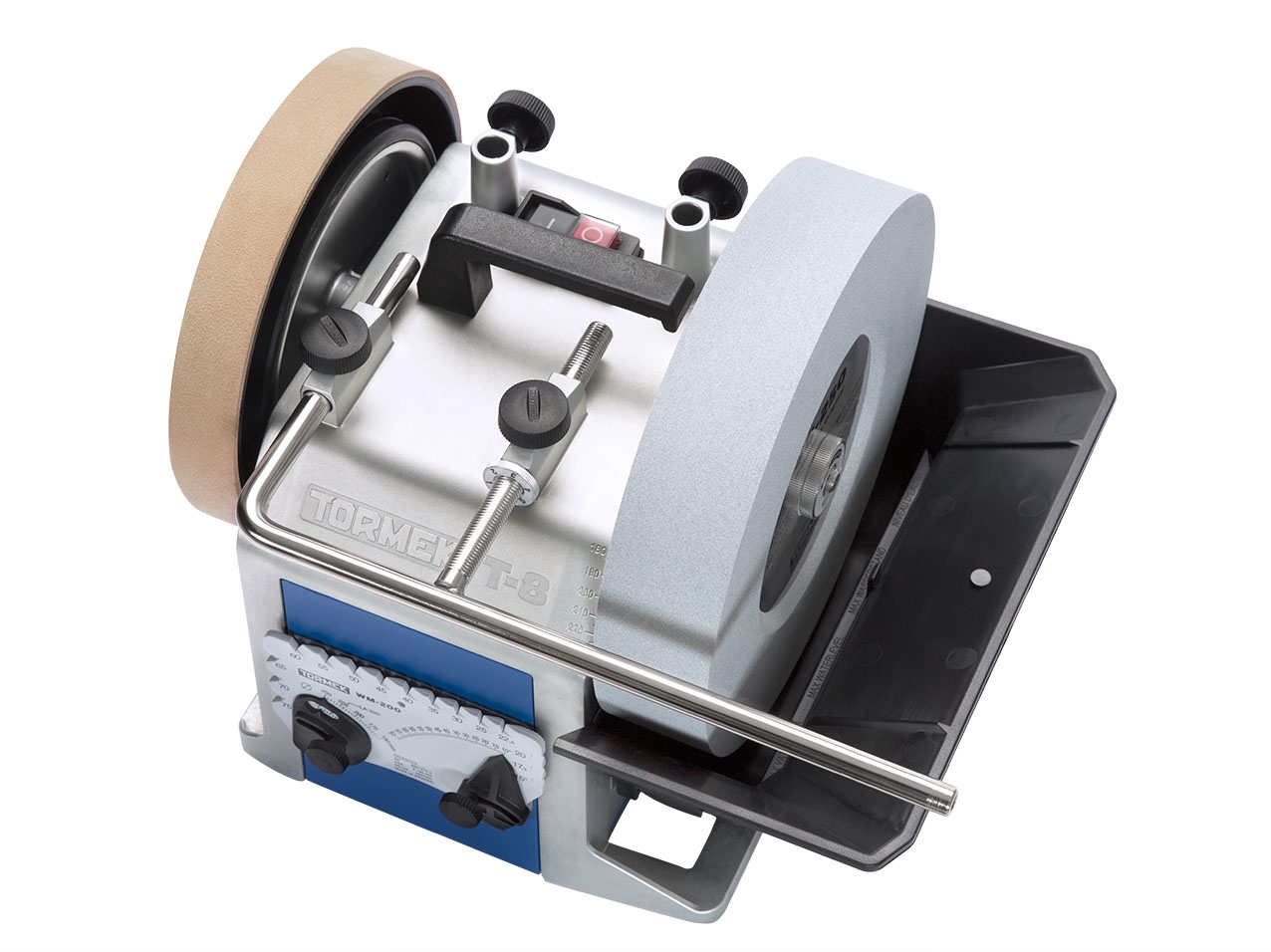 Umfangreiches Komplettset der Nass-Schleifmaschine TORMEK T-8. Passend für Drechselwerkzeuge, Messer, Scheren, Zugmesser, Äxte und kurze Werkzeuge.