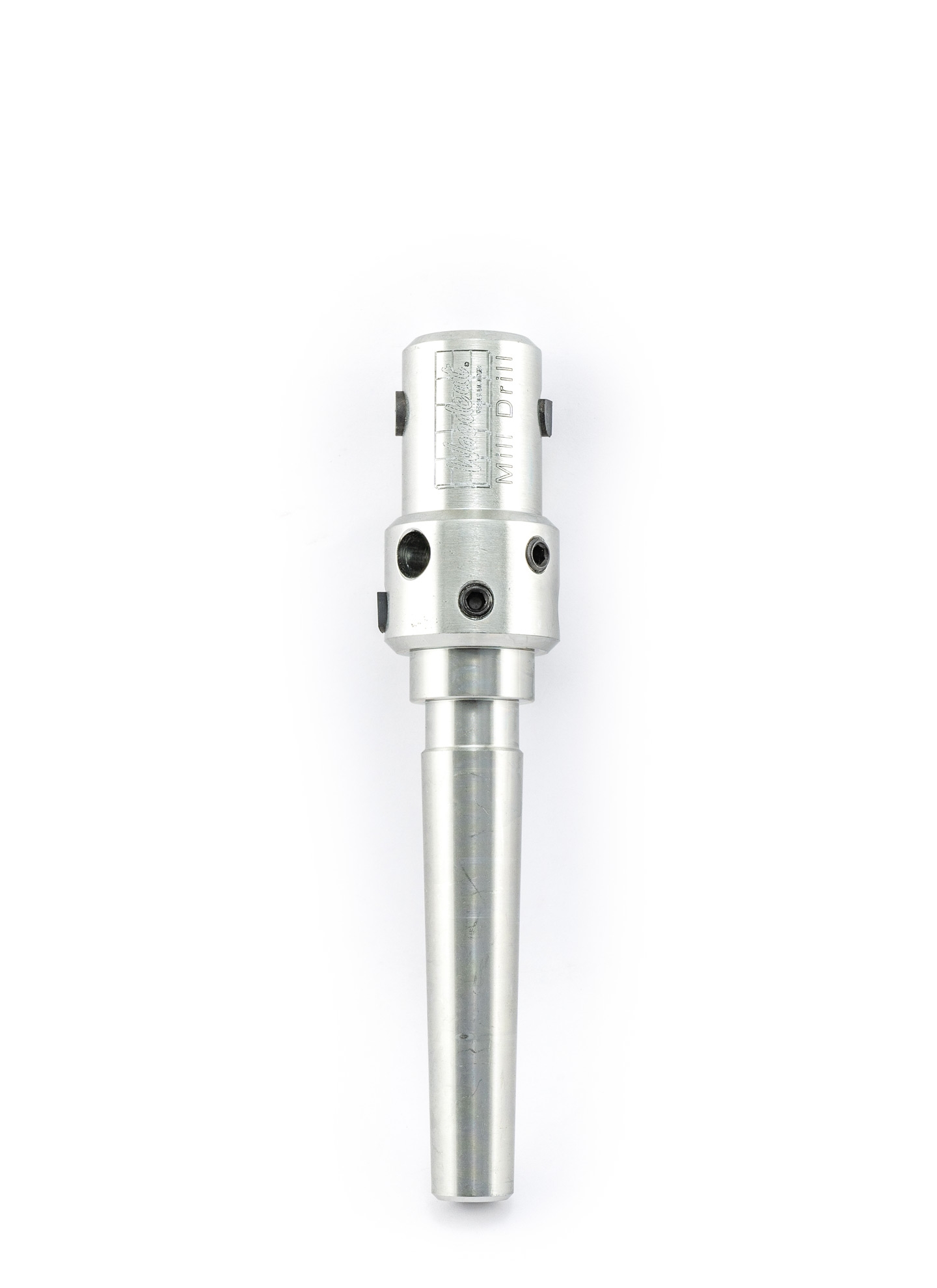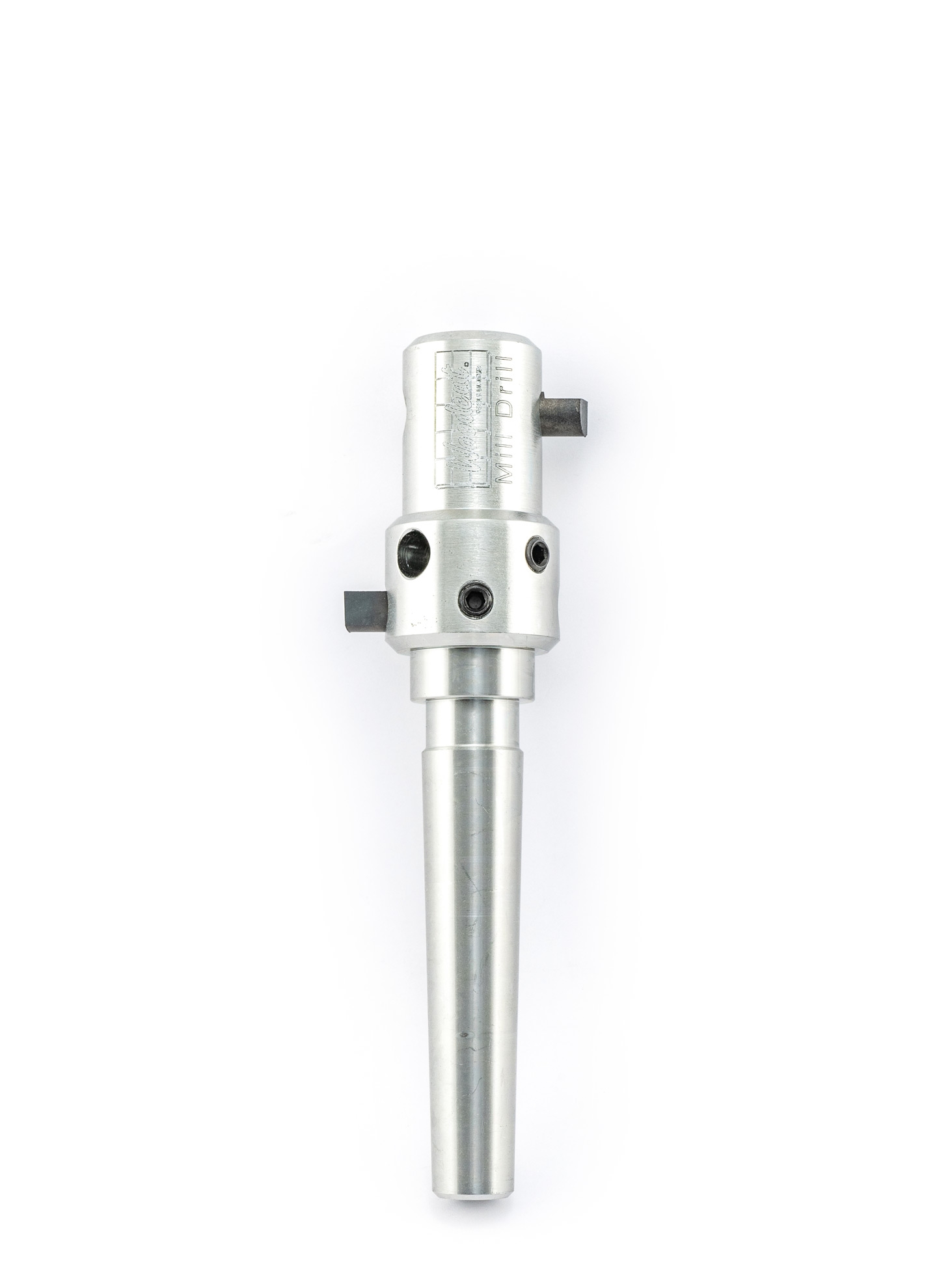 Der Mühlenbohrer besitzt eine MK2-Aufnahme, der Einschub in das sich drehende Werkstück (500 U/min) erfolgt stehend mit der Pinole. Vor Verwendung des Mühlenbohrers muss das Werkstück mit einer 25 mm Durchgangsbohrung versehen werden. Diese Bohrung dient als Führung für den Mühlenbohrer und als Behälter für die spätere Befüllung der Mühle.